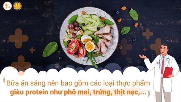 Bữa ăn sáng nên bao gồm các loại thực phẩm giàu protein như phô mai, trứng, thịt nạc…