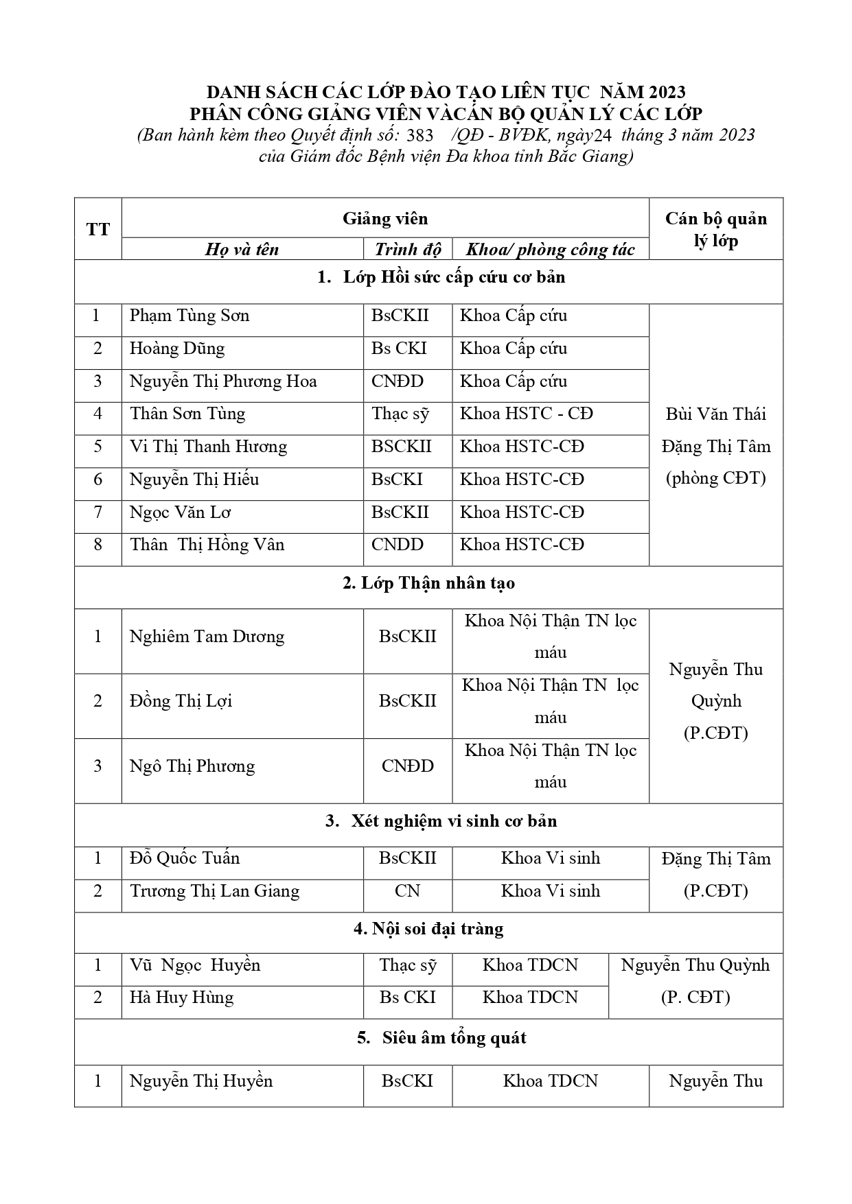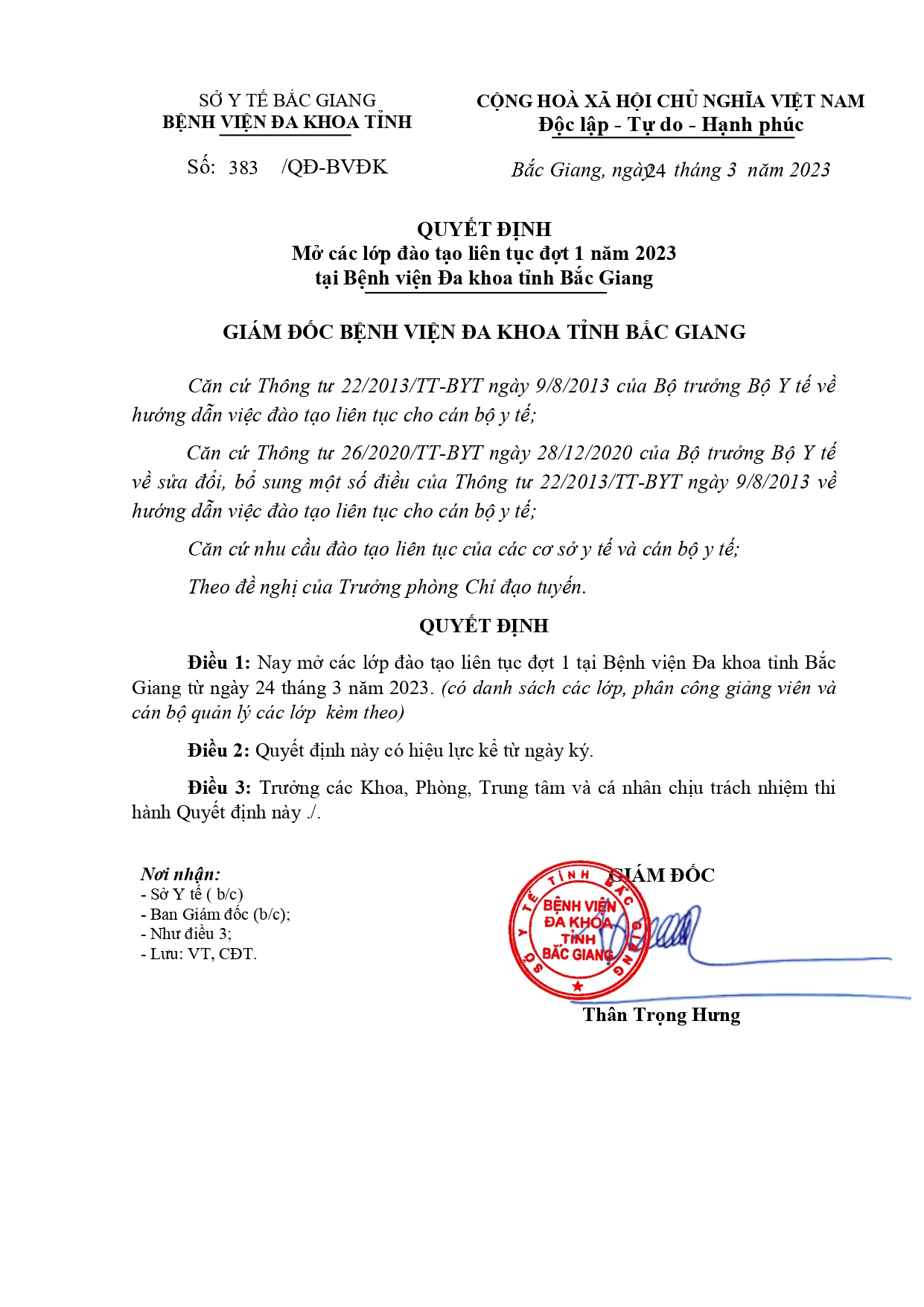 QĐ Mở các lớp đào tạo liên tục đợt 1 năm 2023 tại BVĐK tỉnh Bắc Giang
