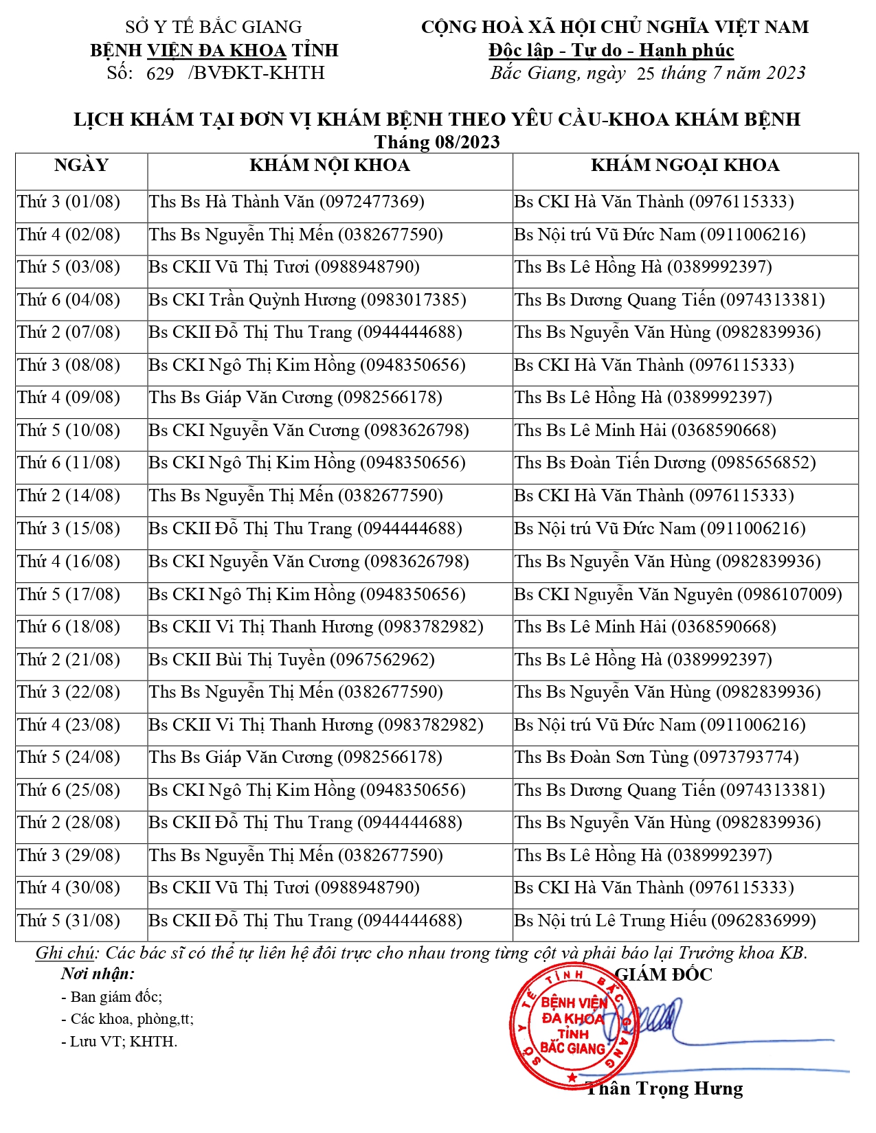 Thứ 3, 01/08/2023 | 08:40 A- A A+ | LỊCH KHÁM BỆNH YÊU CẦU BỆNH VIỆN T08/2023 Đọc bài Lưu Tổng số điểm của bài viết là: 0 trong 0 đánh giá Click để đánh giá bài viết