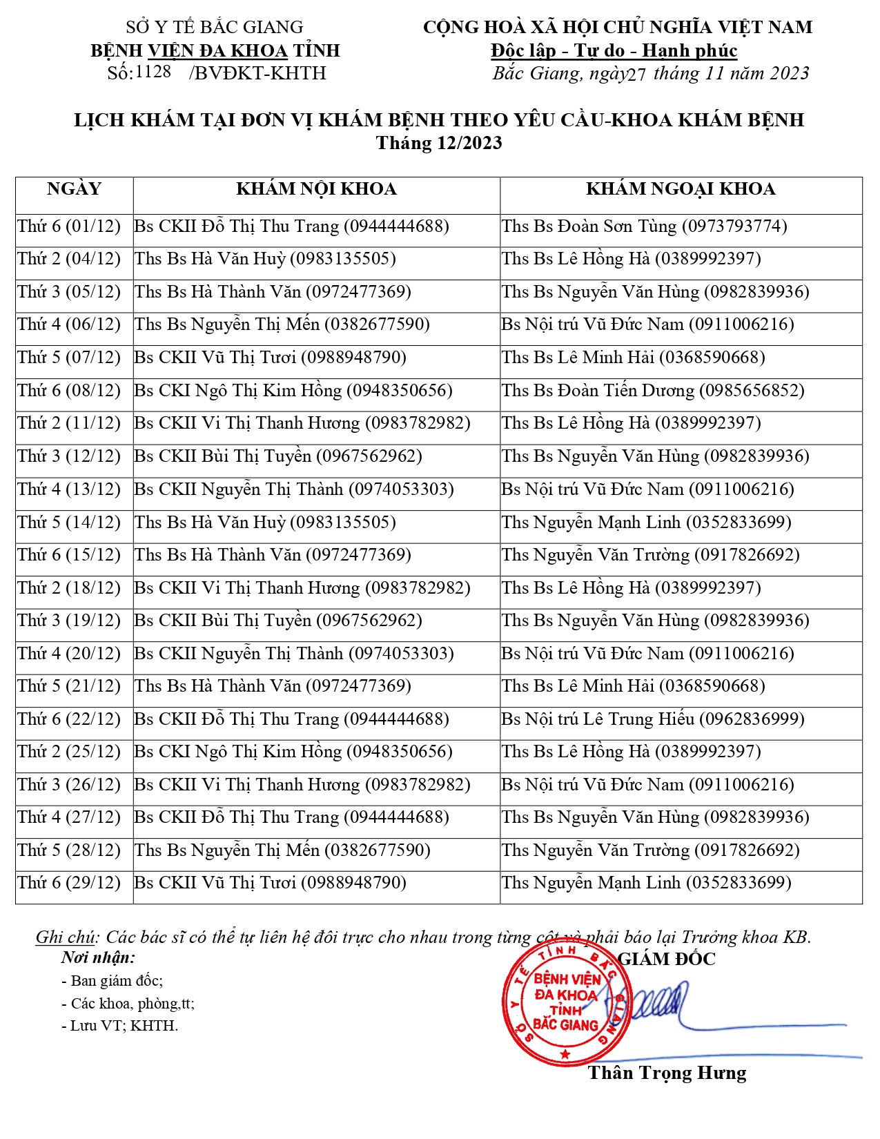 Thứ 2, 27/11/2023 | 15:50 A- A A+ | LỊCH KHÁM BỆNH YÊU CẦU BỆNH VIỆN T12/2023 Đọc bài Lưu Tổng số điểm của bài viết là: 0 trong 0 đánh giá Click để đánh giá bài viết