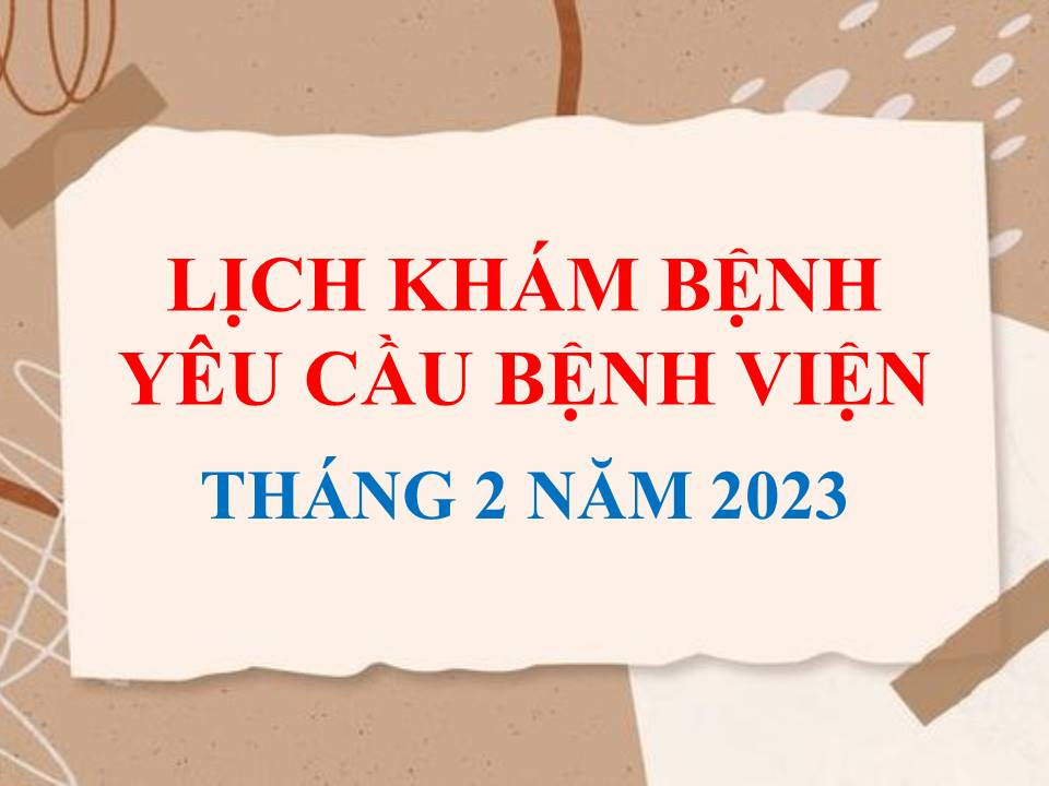 Thứ 3, 31/01/2023 | 08:24 A- A A+ | LỊCH KHÁM BỆNH YÊU CẦU BỆNH VIỆN T02-2023 Đọc bài Lưu Tổng số điểm của bài viết là: 0 trong 0 đánh giá Click để đánh giá bài viết