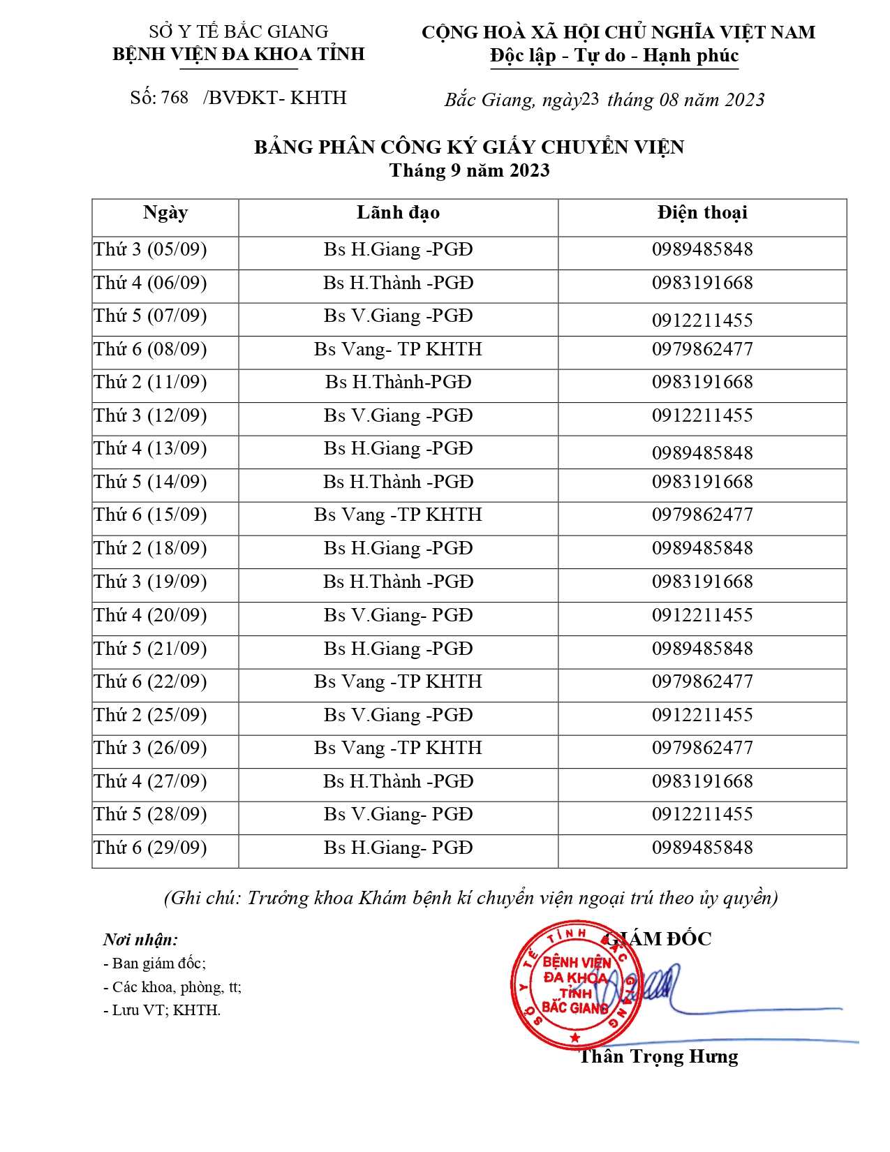 Thứ 4, 23/08/2023 | 11:18 A- A A+ | LỊCH PHÂN CÔNG KÝ GIẤY CHUYỂN VIỆN T09/2023 Đọc bài Lưu Tổng số điểm của bài viết là: 0 trong 0 đánh giá Click để đánh giá bài viết