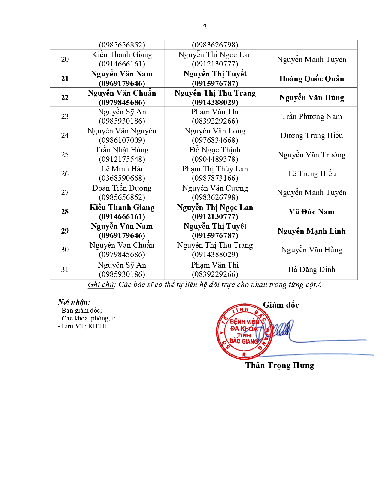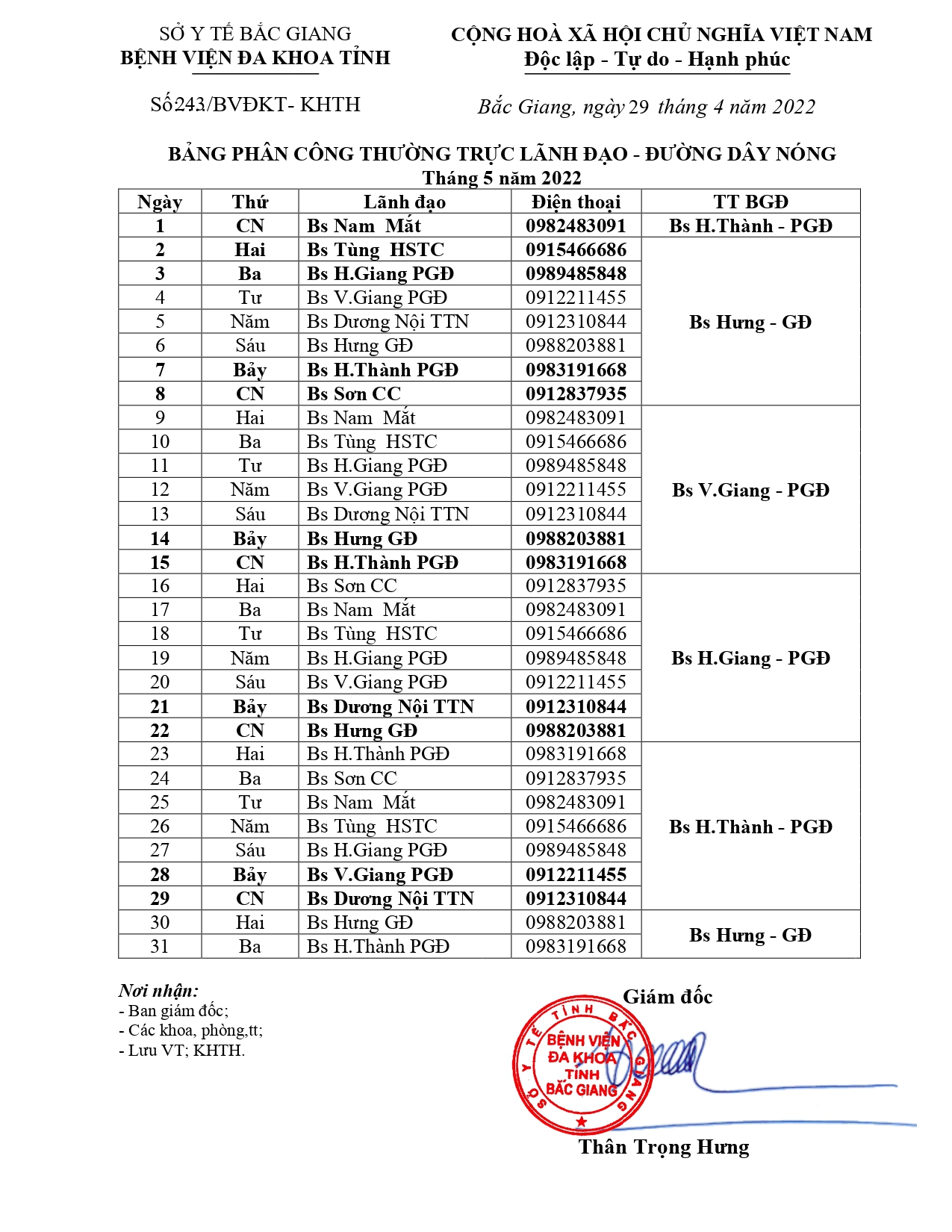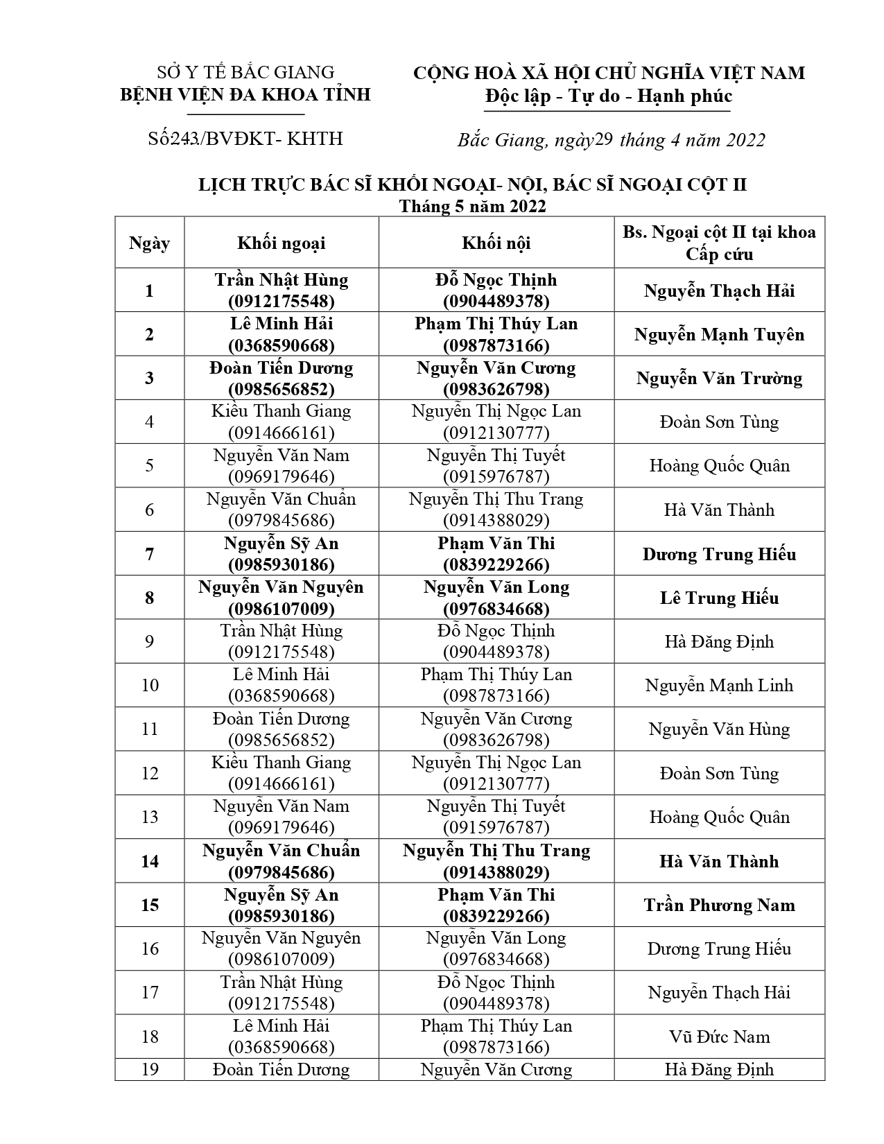 Thứ 4, 04/05/2022 | 09:39 A- A A+ | Lịch trực Bệnh viện Tháng 5/2022 Đọc bài Lưu Tổng số điểm của bài viết là: 0 trong 0 đánh giá Click để đánh giá bài viết