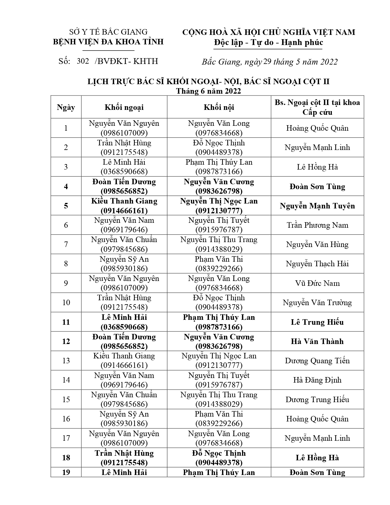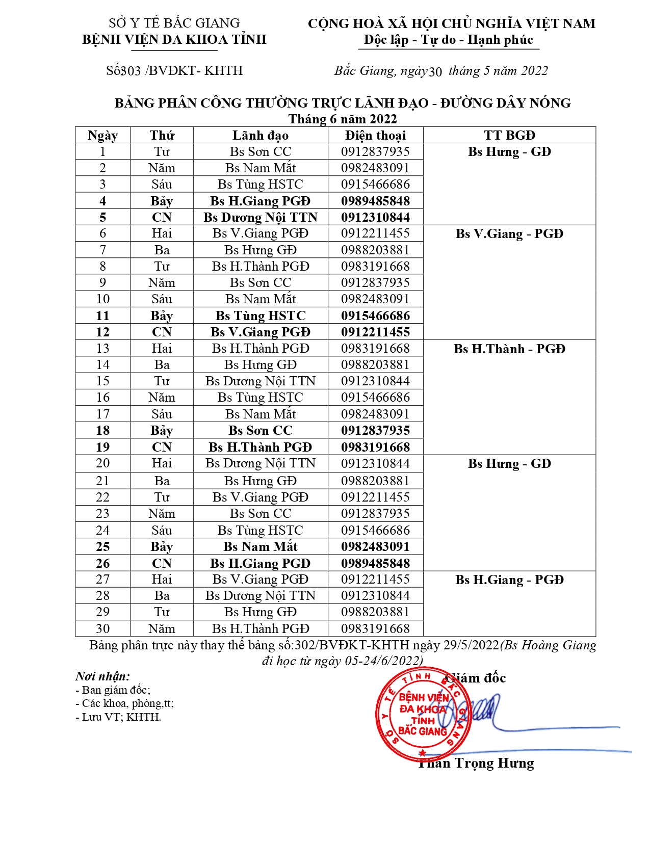 Lịch trực lãnh đạo và Lịch trực Khối Tháng 6 năm 2022