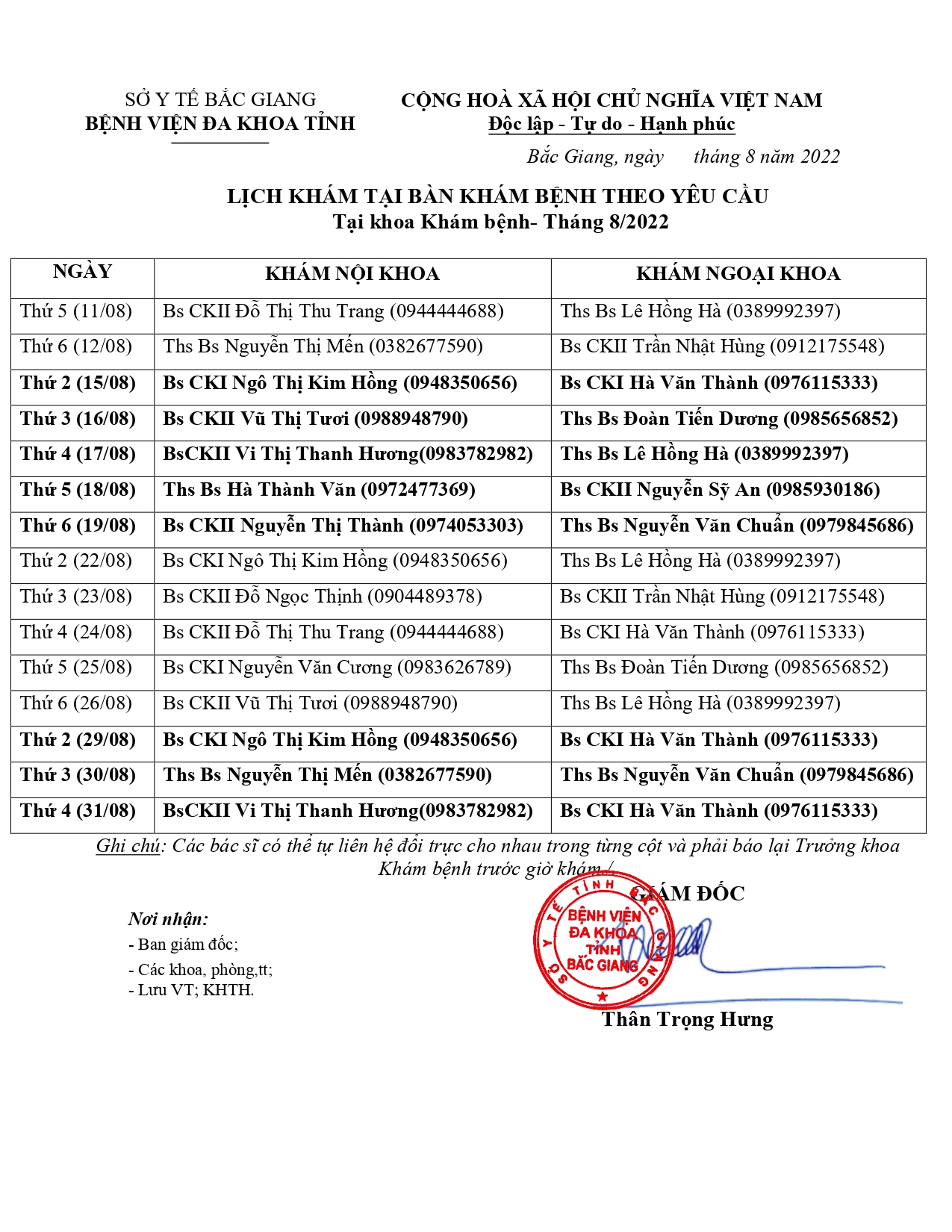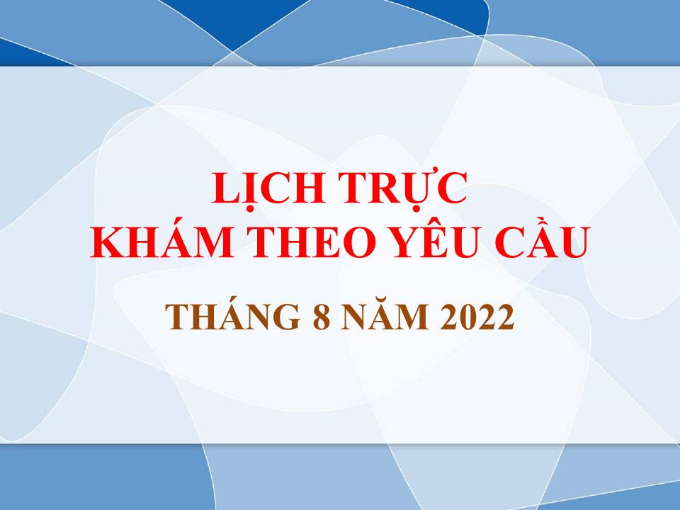 Lịch trực khám theo yêu cầu tháng 8 năm 2022