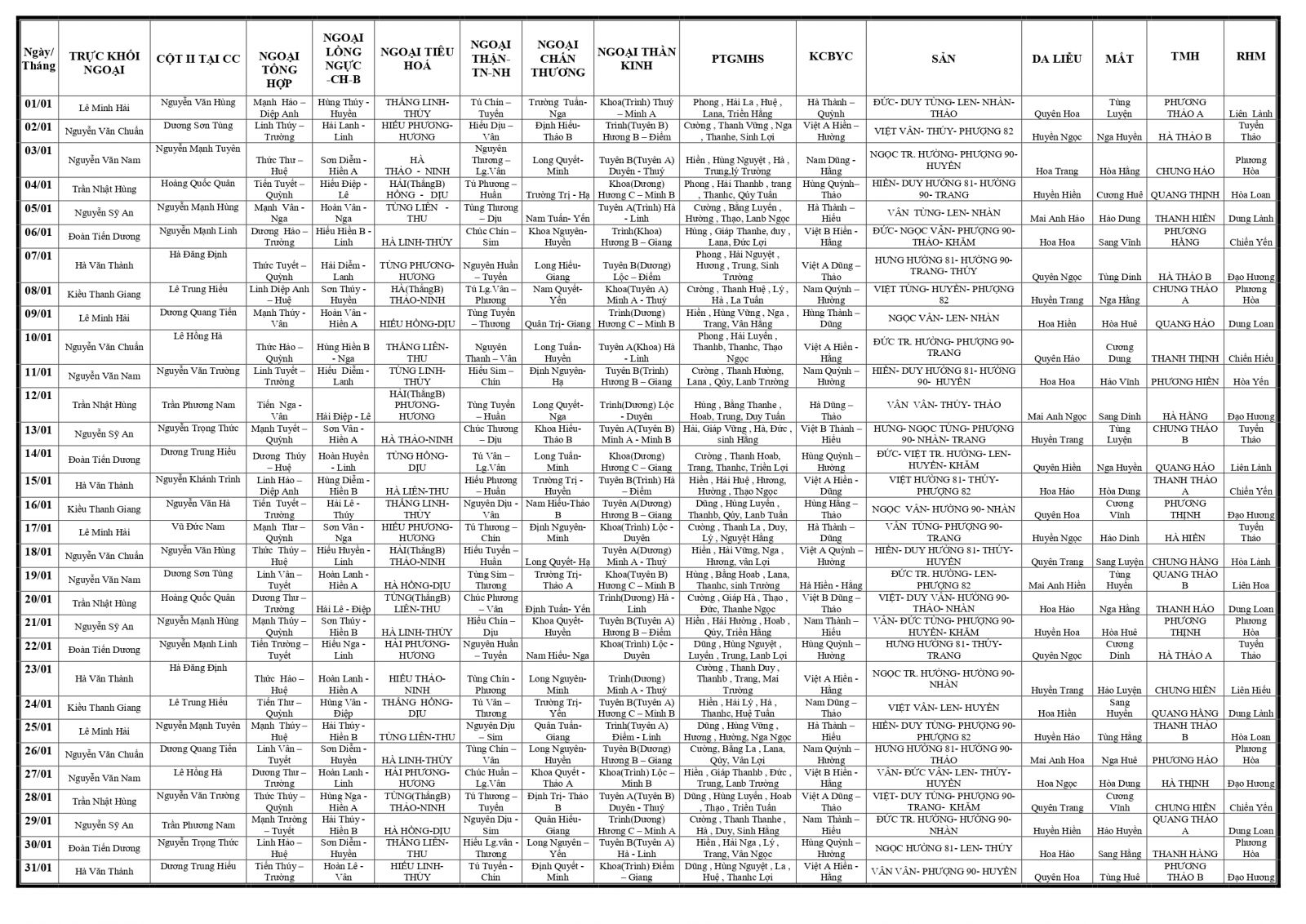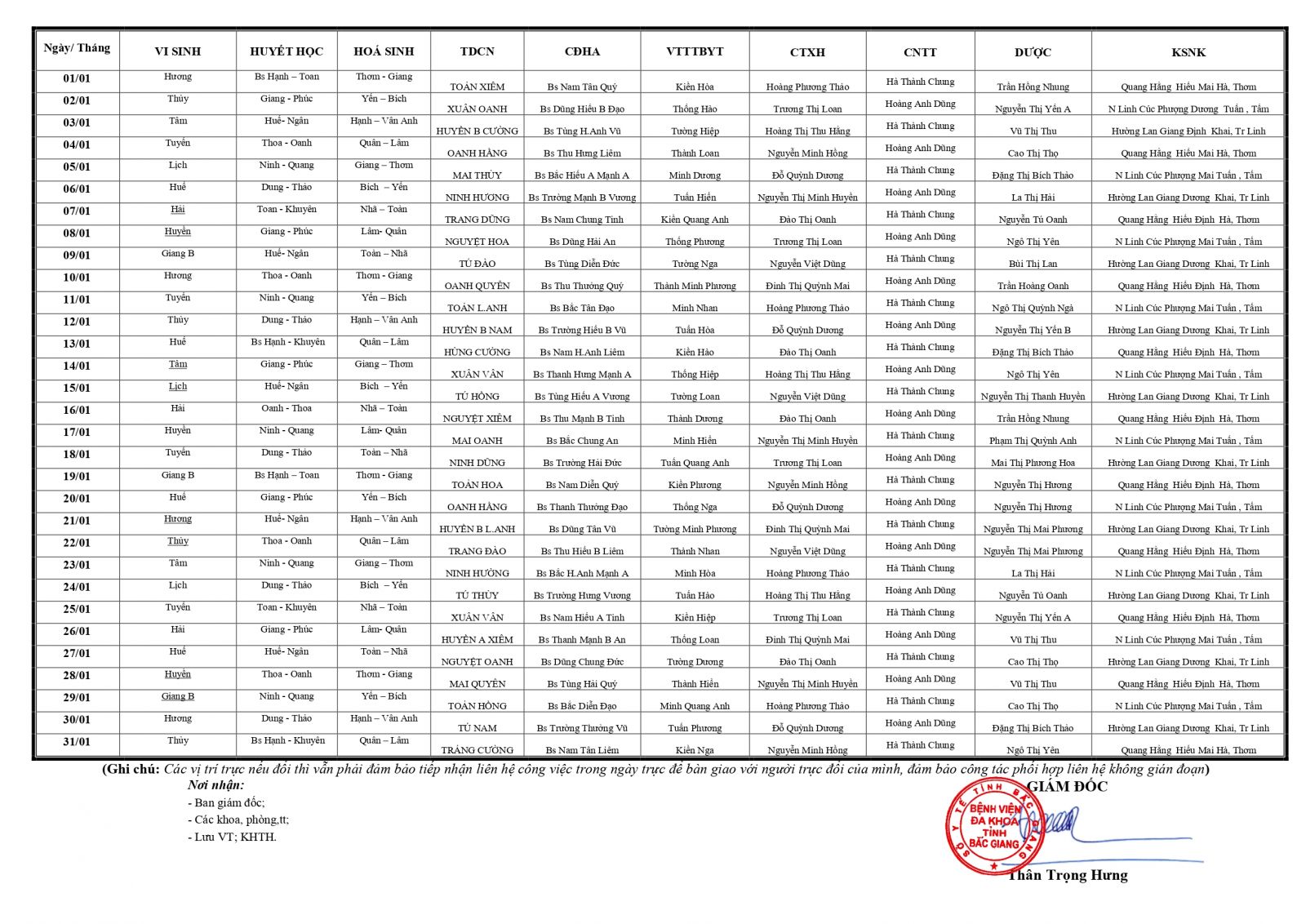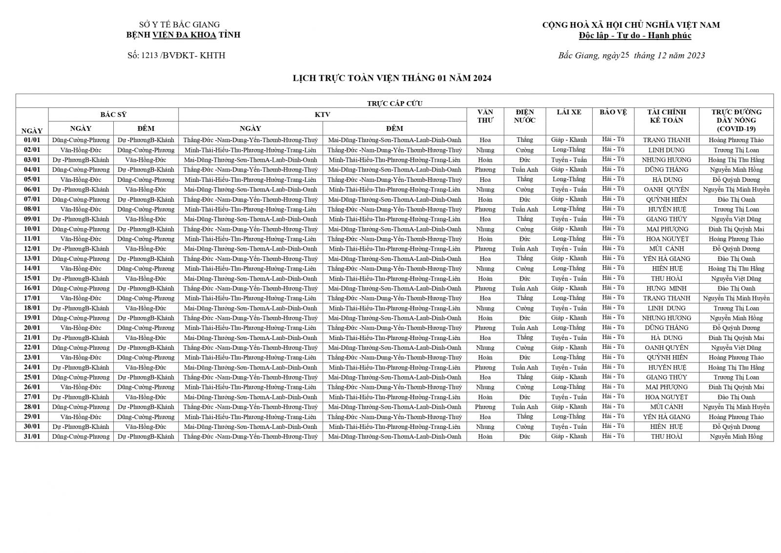 Thứ 3, 26/12/2023 | 15:20 A- A A+ | LỊCH TRỰC TOÀN BỆNH VIỆN T01/2024 Đọc bài Lưu Tổng số điểm của bài viết là: 0 trong 0 đánh giá Click để đánh giá bài viết