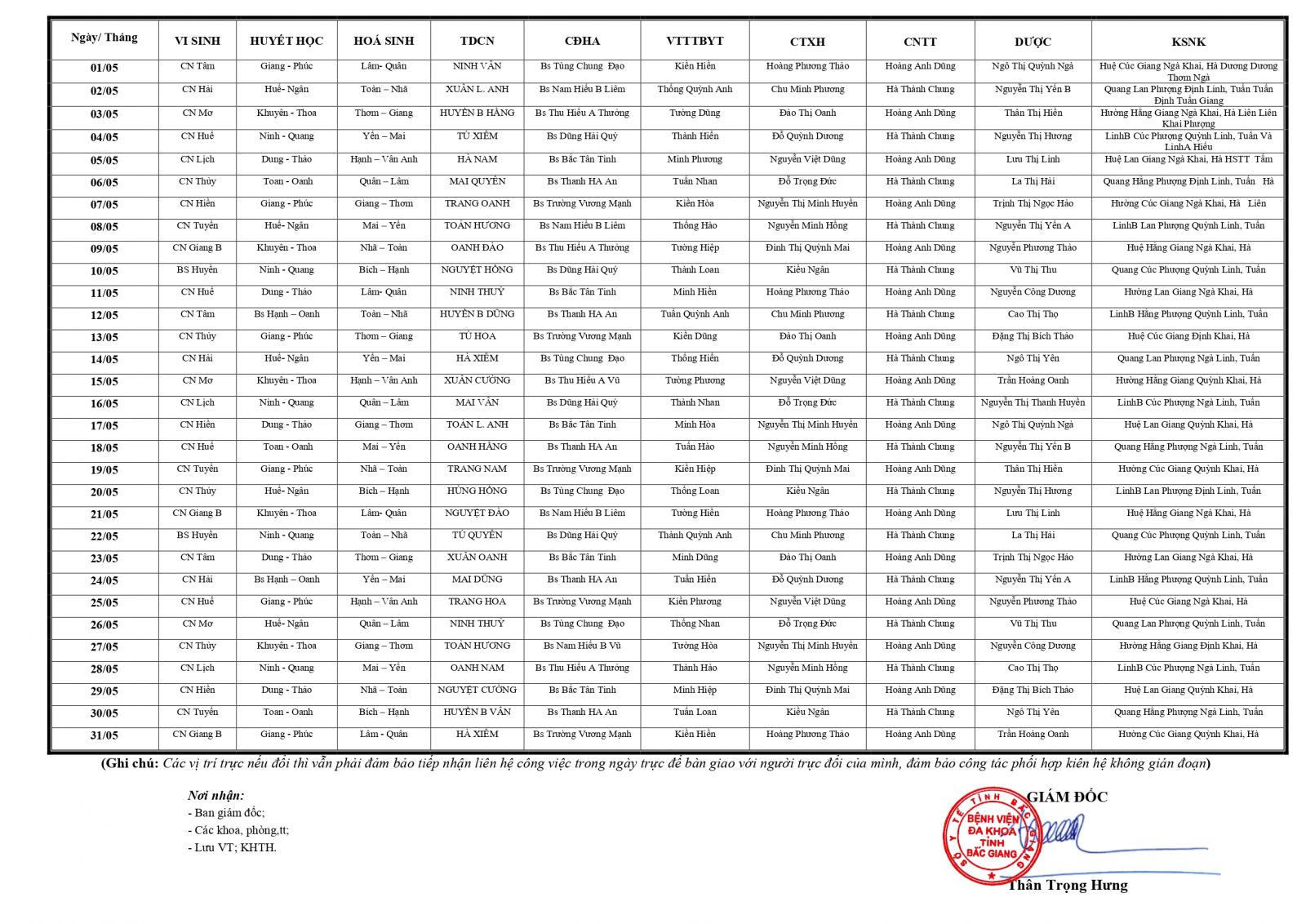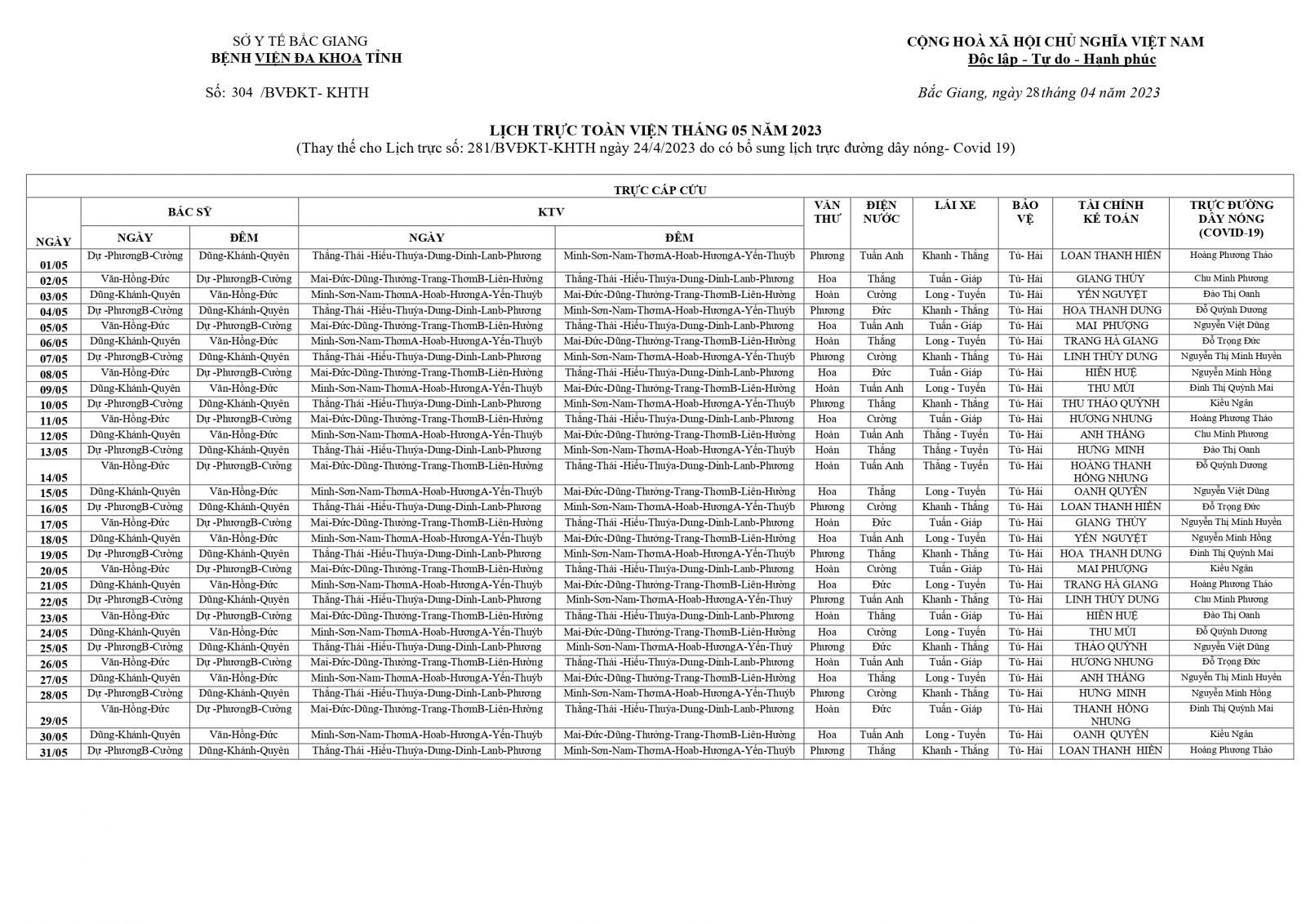 Thứ 6, 28/04/2023 | 07:32 A- A A+ | LỊCH TRỰC TOÀN BỆNH VIỆN T05/2023 Đọc bài Lưu Tổng số điểm của bài viết là: 0 trong 0 đánh giá Click để đánh giá bài viết