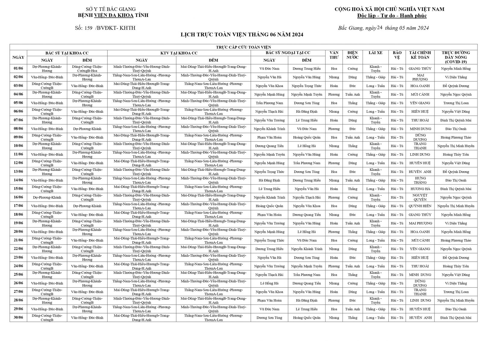 Thứ 6, 24/05/2024 | 11:07 A- A A+ | LỊCH TRỰC TOÀN VIỆN THÁNG 06/2024 Đọc bài Lưu Tổng số điểm của bài viết là: 0 trong 0 đánh giá Click để đánh giá bài viết