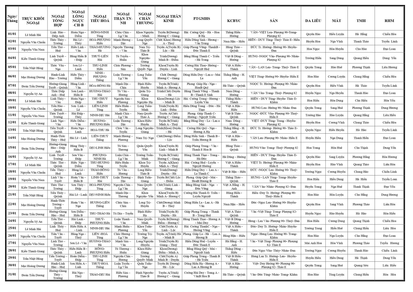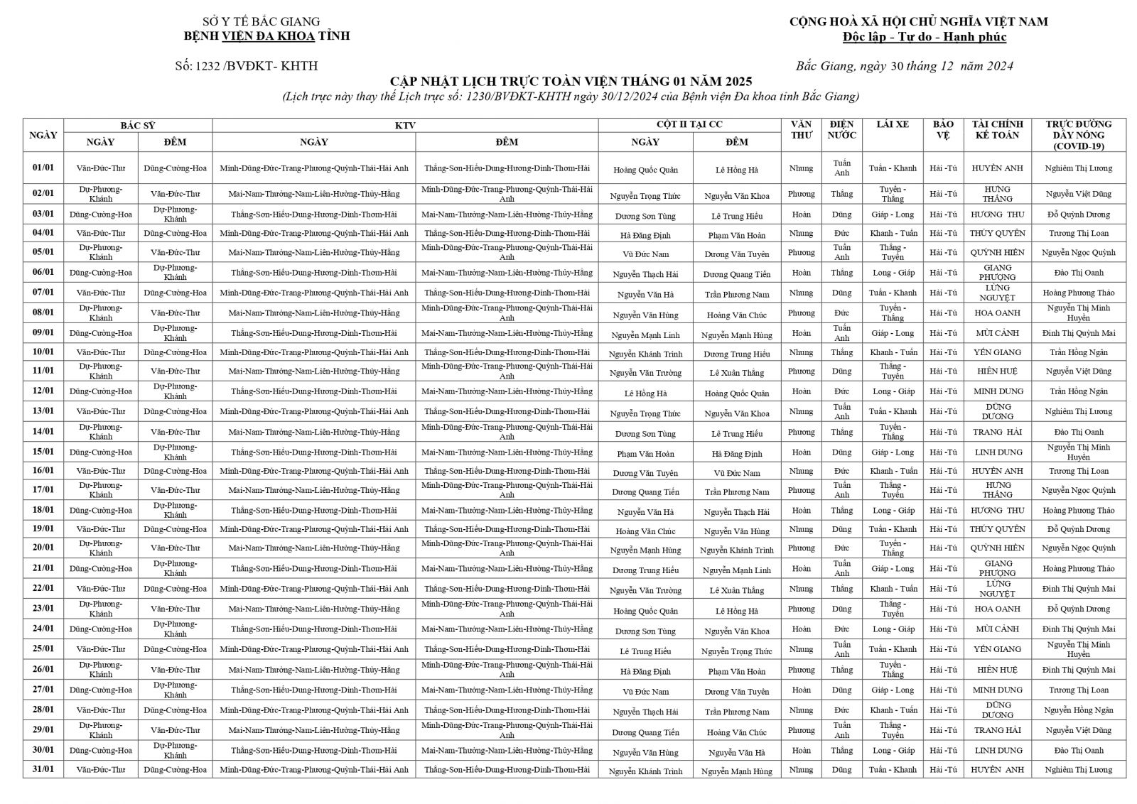Thứ 2, 30/12/2024 | 09:16 A- A A+ | LỊCH TRỰC TOÀN VIỆN THÁNG 1/2025 Đọc bài Lưu Tổng số điểm của bài viết là: 0 trong 0 đánh giá Click để đánh giá bài viết