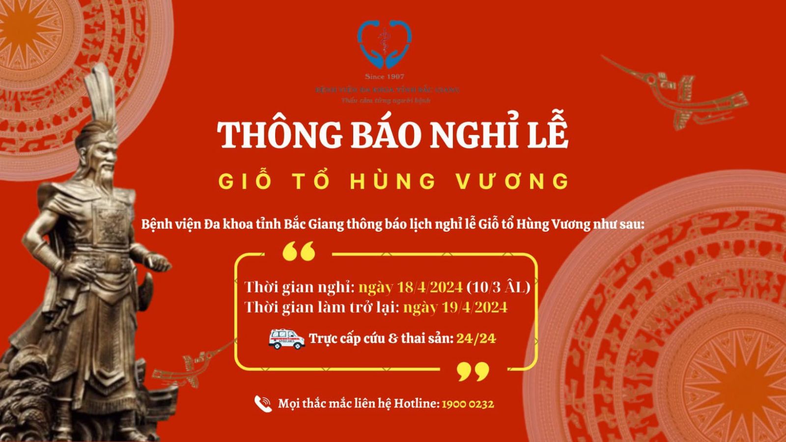 Thứ 3, 16/04/2024 | 12:07 A- A A+ | THÔNG BÁO LỊCH NGHỈ LỄ GIỖ TỔ HÙNG VƯƠNG Đọc bài Lưu Bệnh viện Đa khoa tỉnh Bắc Giang trân trọng thông báo lịch nghỉ lễ Giỗ tổ Hùng Vương như sau:Thời gian nghỉ: ngày 18/4/2024 ( tức 10/3 âm lịch)Thời gian làm trở lại: ngày 19/4/2024Trực cấp cứu và thai sản: 24/24Mọi thắc mắc vui lòng liên hệ Hotline: 1900 0232-----------------------------------------------------Nguồn: Phòng CTXHAdd: Bệnh viện Đa khoa tỉnh Bắc Giang, Đường Lê Lợi, Phường Hoàng Văn Thụ, Thành phố Bắc Giang, Tỉnh Bắc Giang.Hotline: 1900 0232Website: Http://bvdktinhbacgiang.vnEmail: tiepnhanthongtinbvdkbg@gmail.com Tổng số điểm của bài viết là: 0 trong 0 đánh giá Click để đánh giá bài viết