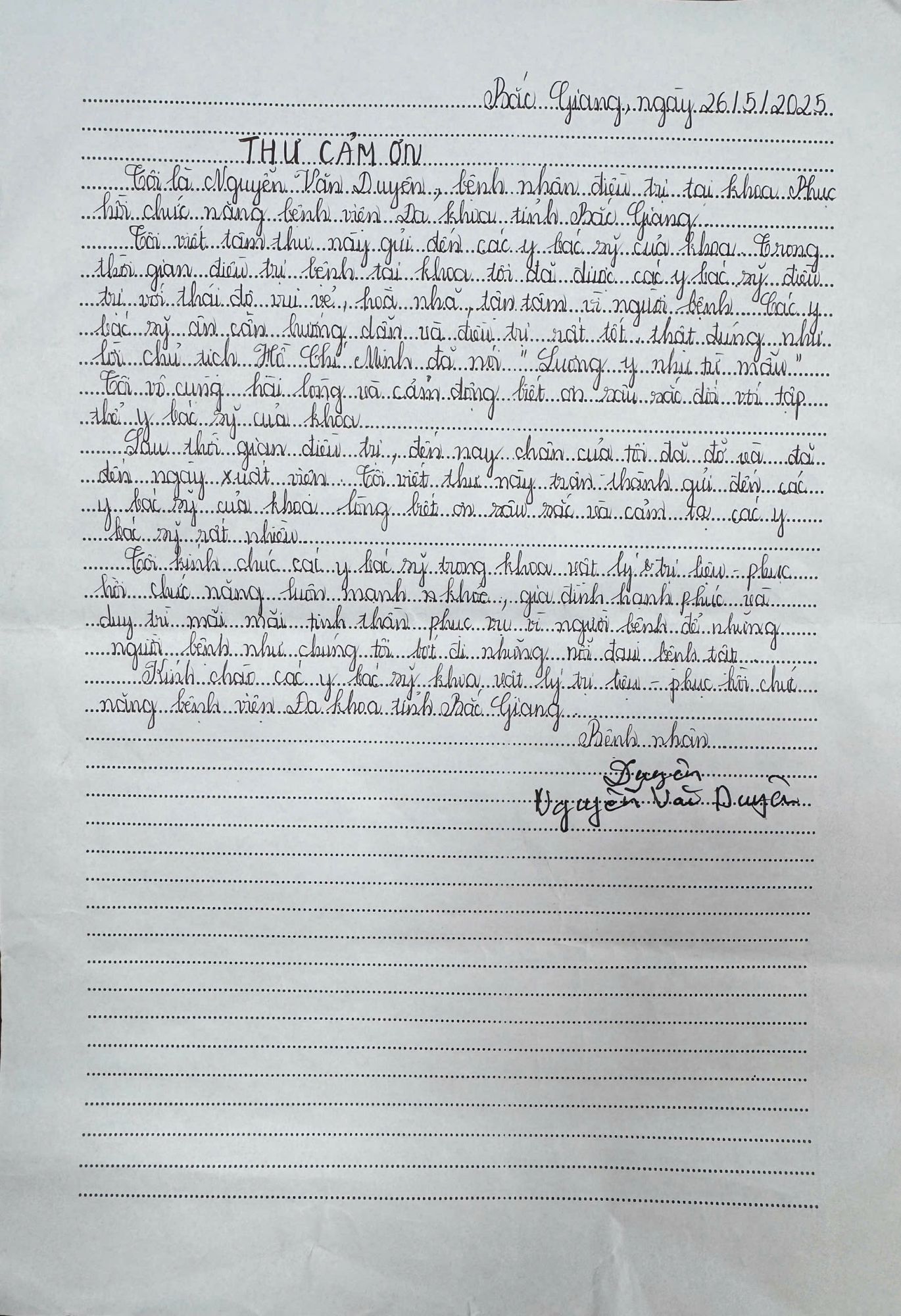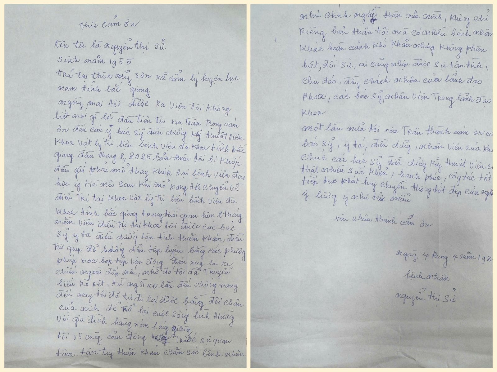 Một bức thư khác đến từ cụ bà Nguyễn Thị Sử, sinh năm 1955, là minh chứng sống động cho sự chuyên nghiệp và tấm lòng bao dung của đội ngũ cán bộ y tế. Cụ bày tỏ sự xúc động khi không chỉ nhận được phác đồ điều trị hợp lý mà còn được các bác sĩ, điều dưỡng và kỹ thuật viên trong khoa dành sự chăm sóc như người thân. “Tôi xin trân trọng cảm ơn đến các y bác sĩ điều dưỡng Khoa Vật lý trị liệu, Bệnh viện Đa khoa tỉnh Bắc Giang… Không chỉ riêng tôi mà ai cũng nhận được sự tận tình, chu đáo.”
