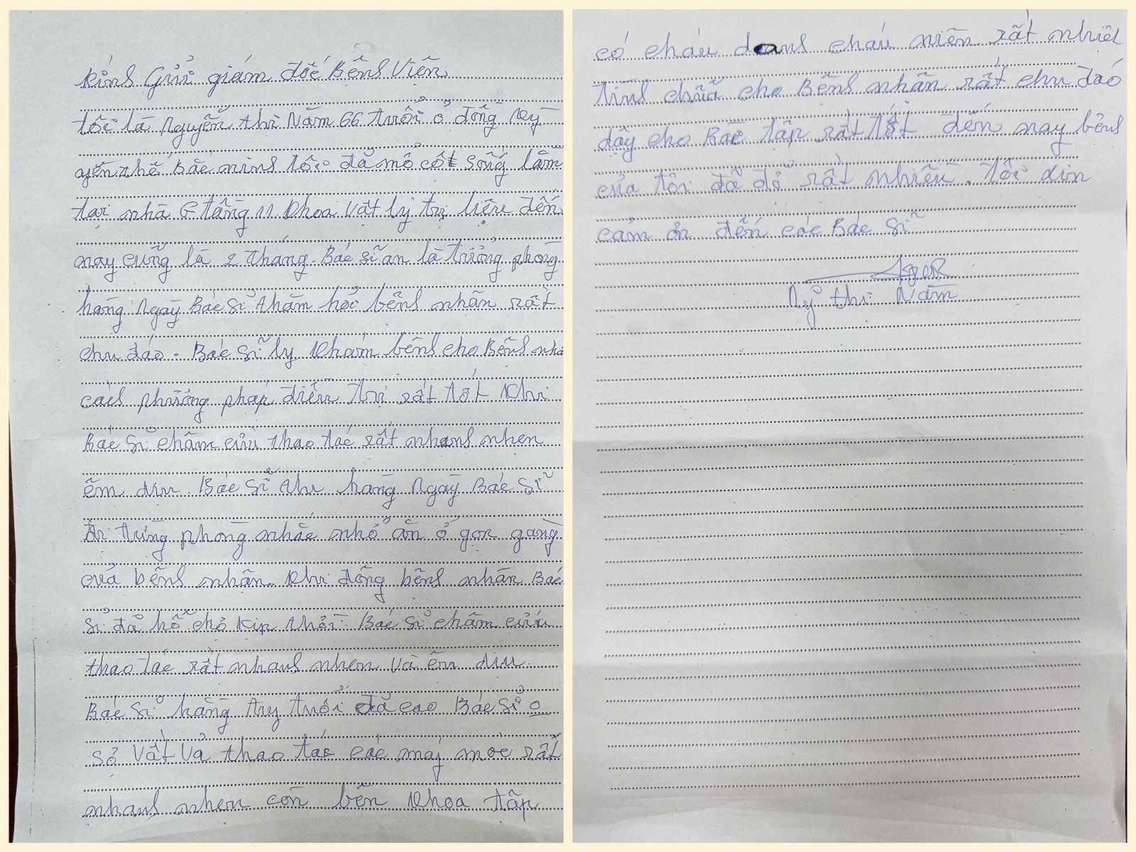 Trong một bức thư viết tay nắn nót, bà Ngô Thị Năm, 66 tuổi, bày tỏ lòng cảm kích sâu sắc sau quá trình được thăm khám và điều trị tại Khoa Vật lý trị liệu. Bà chia sẻ mình bị đau nhức xương khớp, đi lại khó khăn, nhưng nhờ sự kiên trì, tận tụy của các bác sĩ và kỹ thuật viên, đặc biệt là sự hướng dẫn ân cần mỗi ngày, sức khỏe của bà đã cải thiện rõ rệt. “Tôi rất mừng, tôi xin cảm ơn đến các bác sĩ, các cháu nhân viên rất nhiều,” bà viết bằng cả tấm lòng.