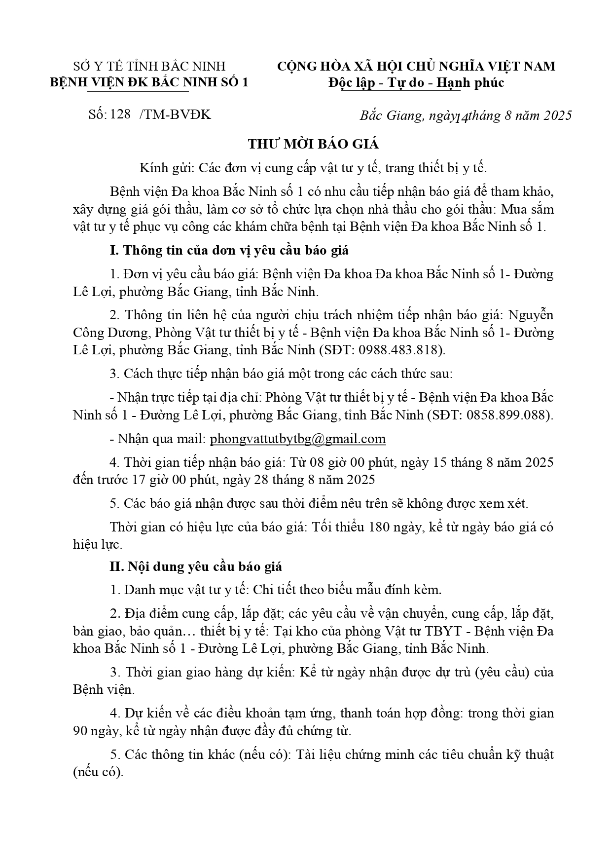 Thứ 6, 15/08/2025 | 09:22 A- A A+ | Thư mời báo giá số 128 Đọc bài Lưu File thư mời + phụ lục: thư mời báo giá số 128.rar------------------ Tổng số điểm của bài viết là: 0 trong 0 đánh giá Click để đánh giá bài viết