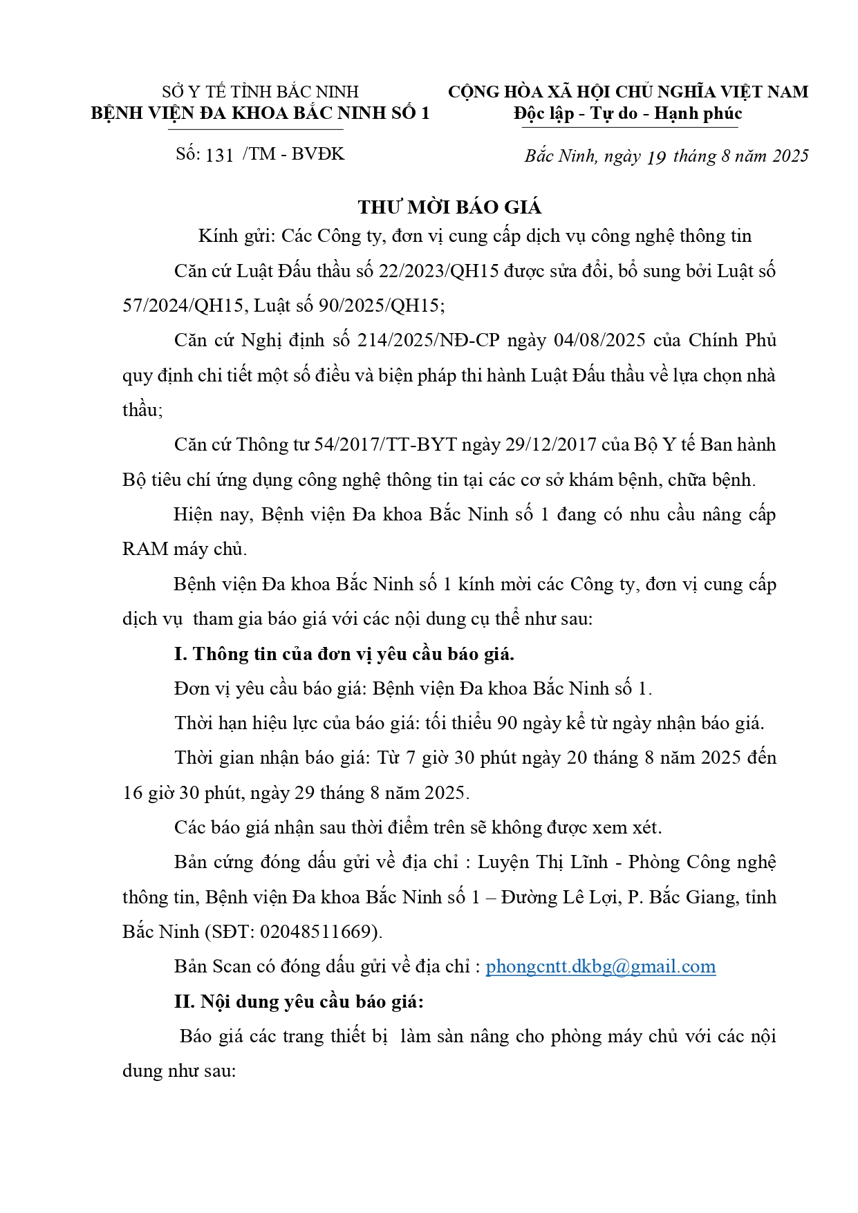 Thứ 4, 20/08/2025 | 09:25 A- A A+ | Thư mời báo giá số 131 Đọc bài Lưu File thư mời: thư mời báo giá ram máy chủ__19082025220016_signed.pdf--------------------- Tổng số điểm của bài viết là: 0 trong 0 đánh giá Click để đánh giá bài viết