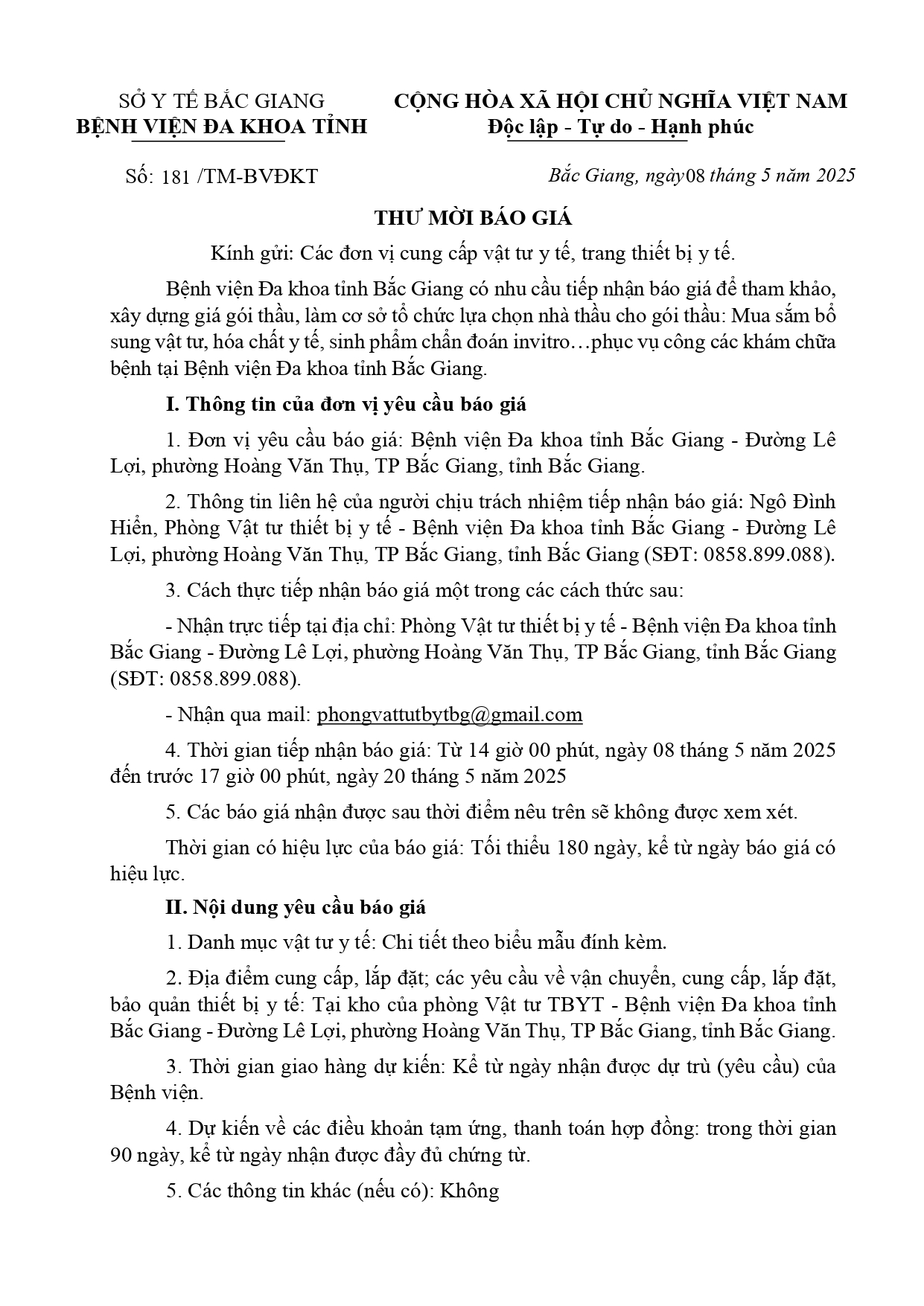 Thứ 6, 09/05/2025 | 09:31 A- A A+ | Thư mời báo giá số 181 Đọc bài Lưu Thư mời + phụ lục: thư mời 181.rar------------------- Tổng số điểm của bài viết là: 0 trong 0 đánh giá Click để đánh giá bài viết