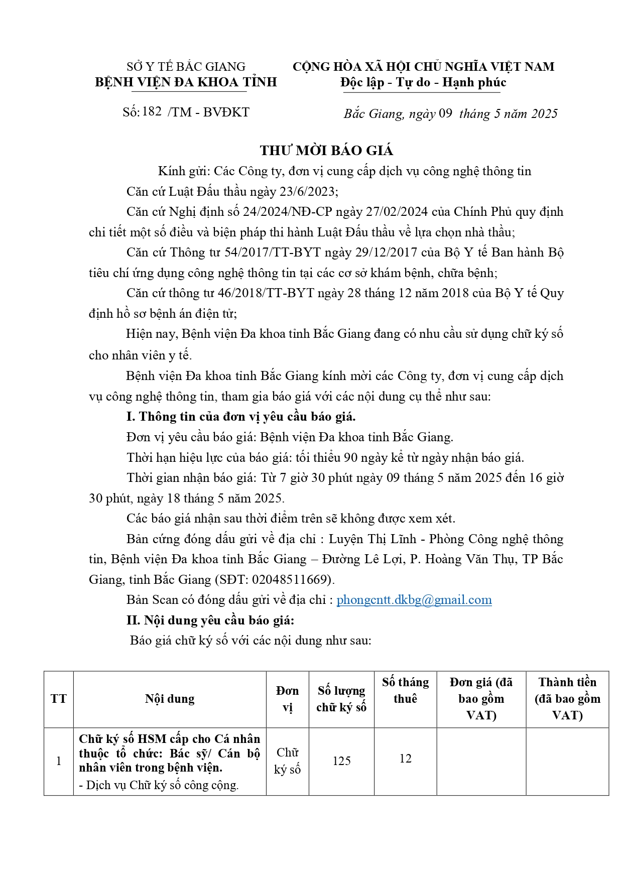 Thứ 6, 09/05/2025 | 15:17 A- A A+ | Thư mời báo giá số 182 Đọc bài Lưu Tổng số điểm của bài viết là: 0 trong 0 đánh giá Click để đánh giá bài viết