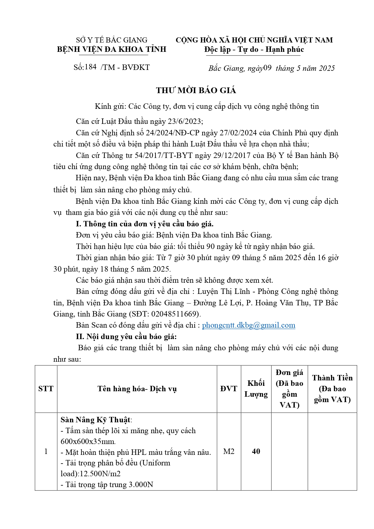 Thứ 6, 09/05/2025 | 15:17 A- A A+ | Thư mời báo giá số 184 Đọc bài Lưu Tổng số điểm của bài viết là: 0 trong 0 đánh giá Click để đánh giá bài viết