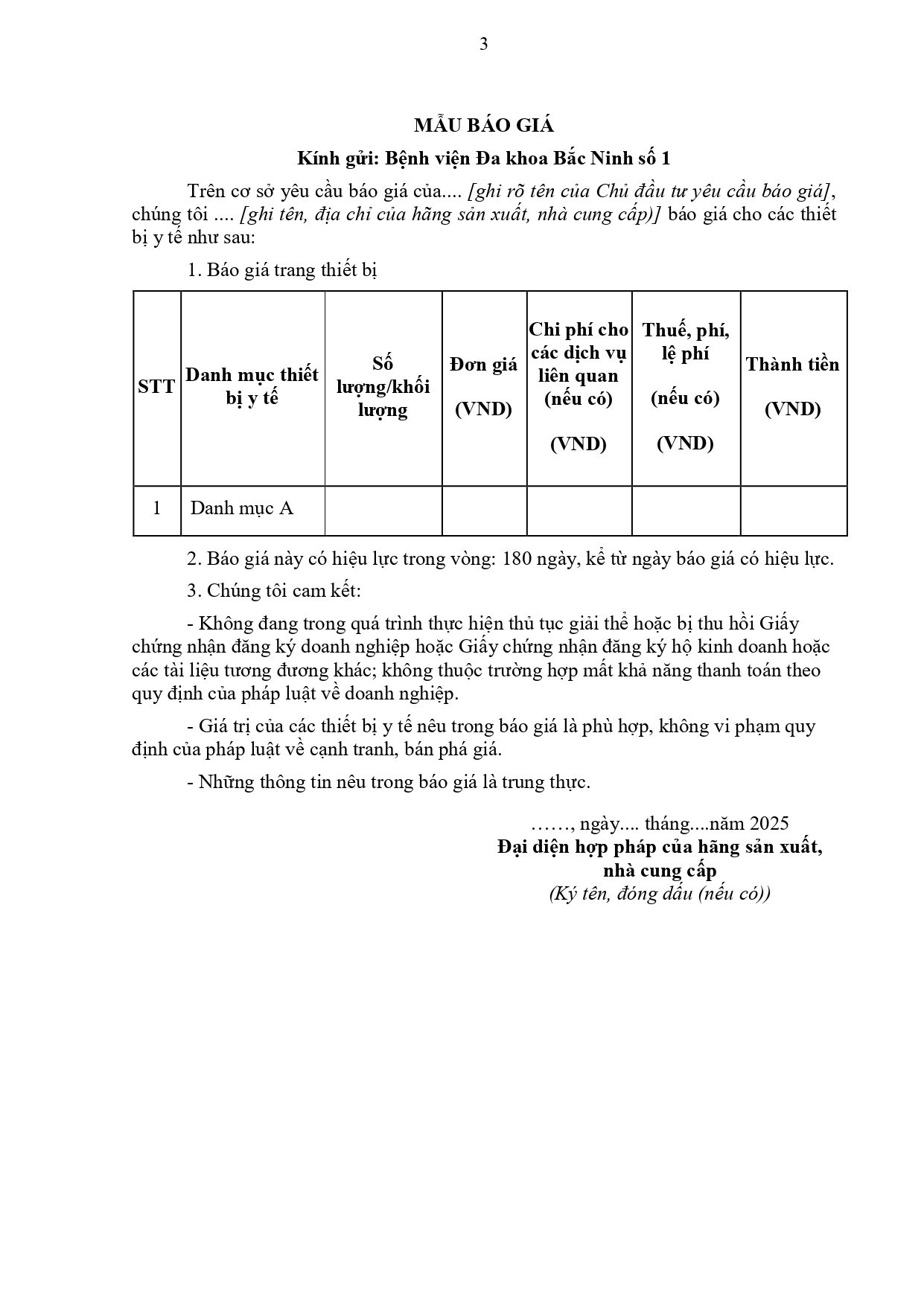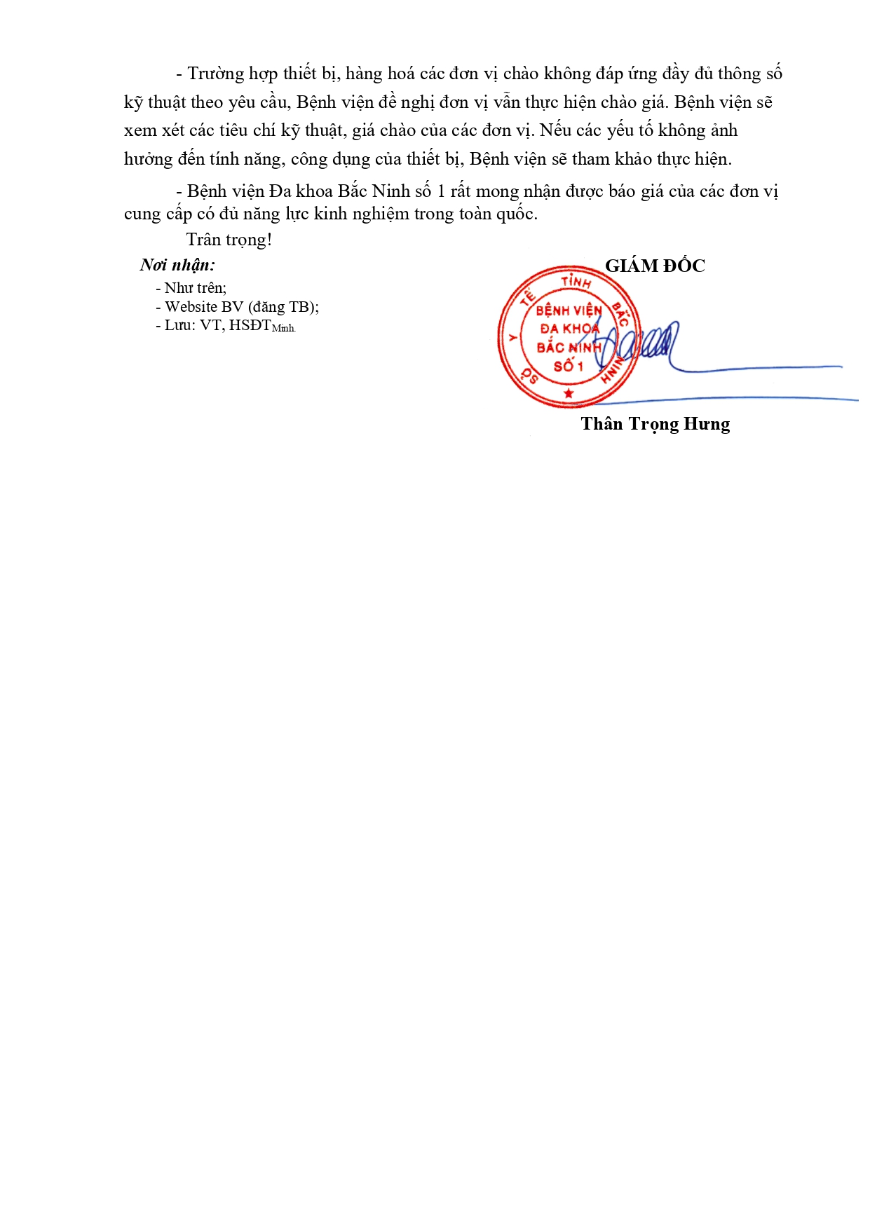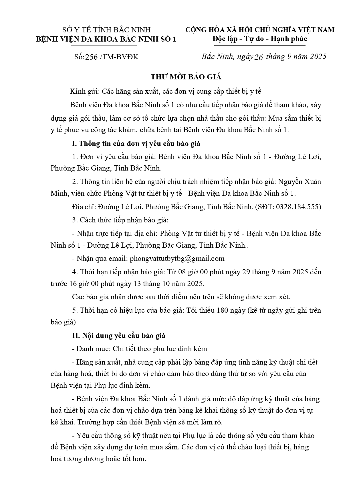 Thư mời chào giá gói thầu: Cung cấp dịch vụ vệ sinh công nghiệp trong thời gian 24 tháng cho Bệnh viện Đa khoa Bắc Ninh số 1