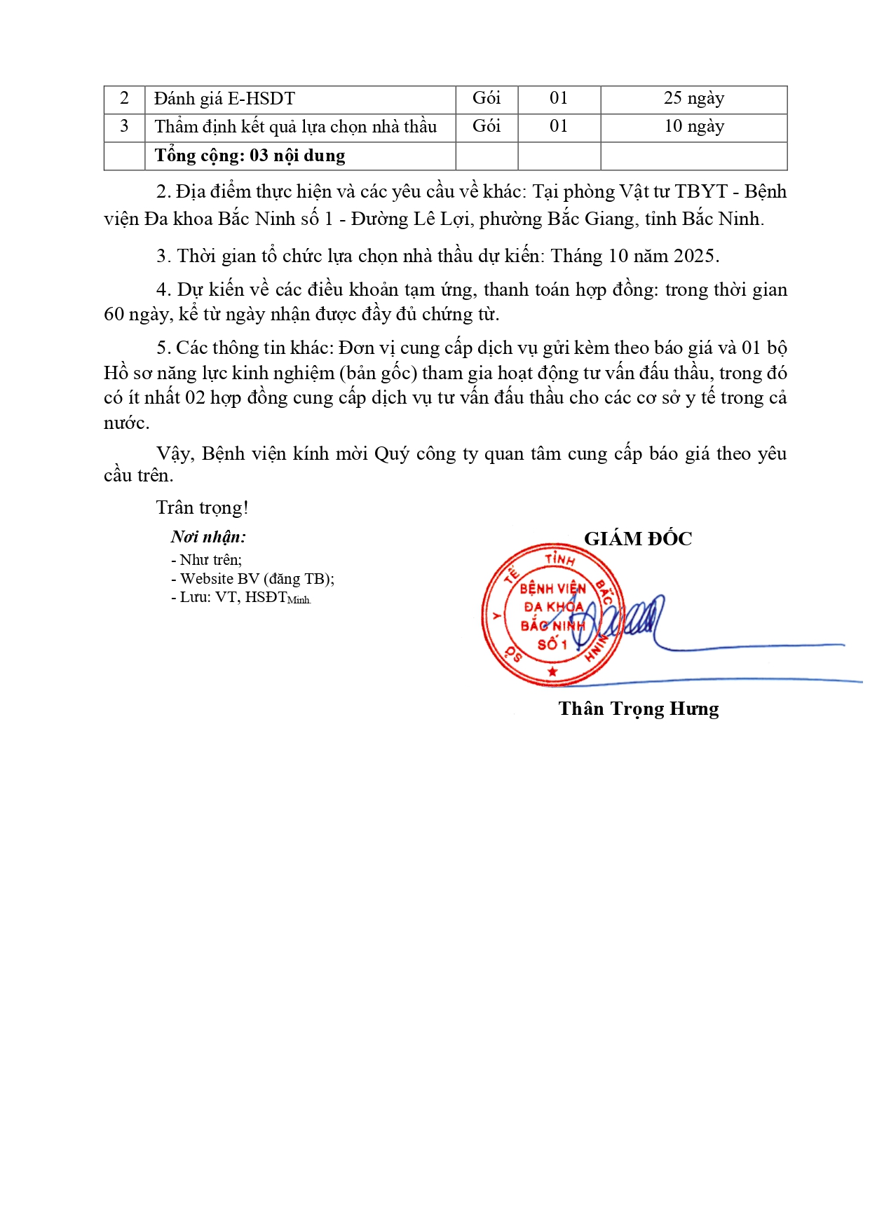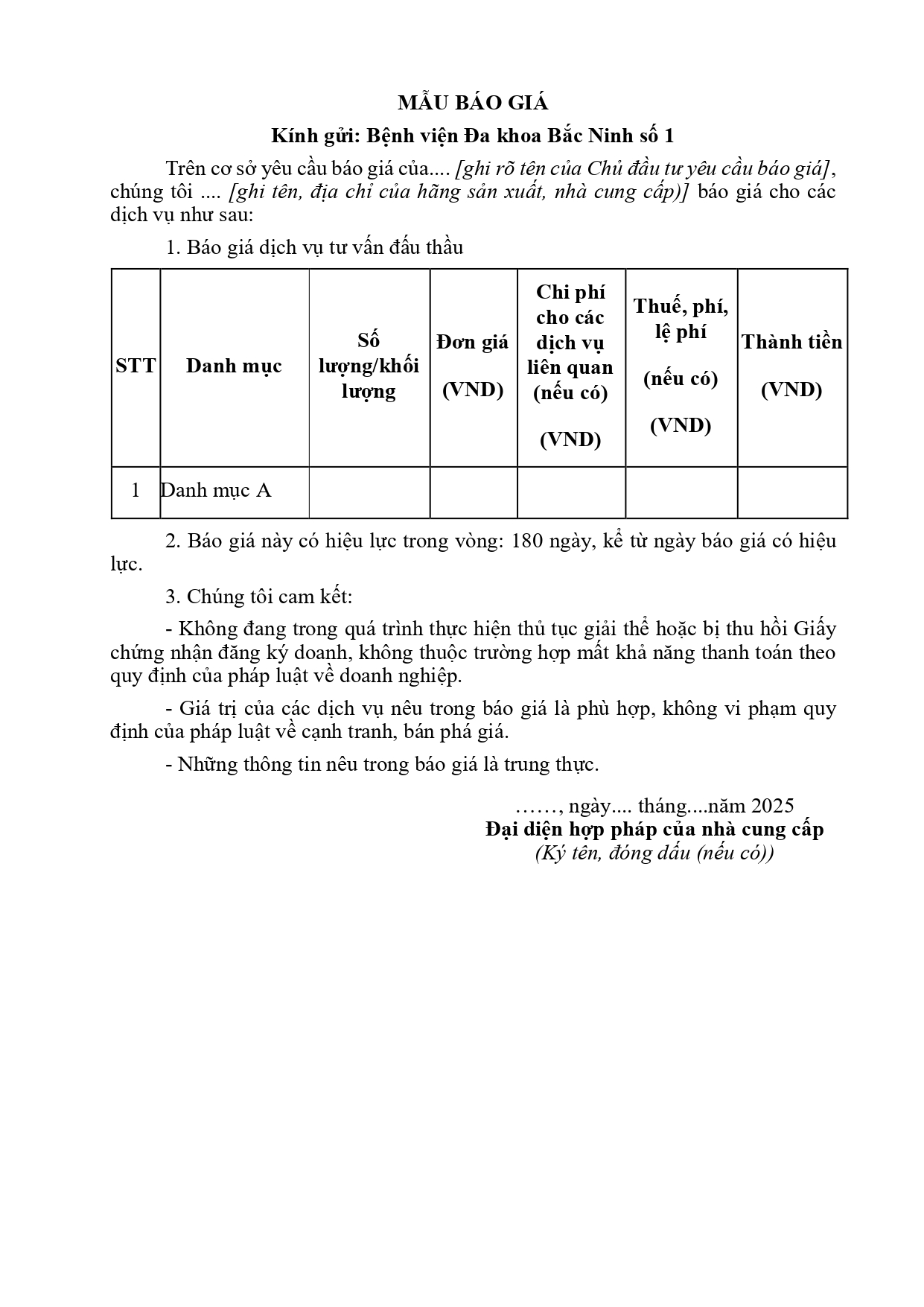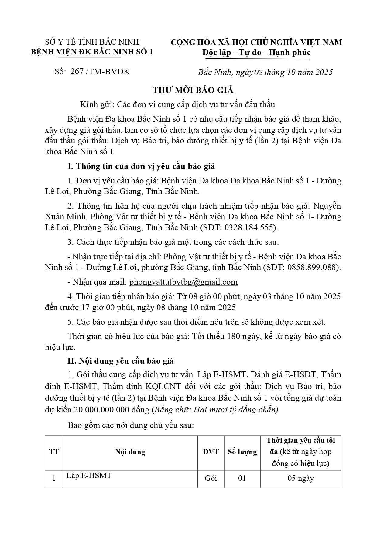 Thư mời chào giá gói thầu: Cung cấp dịch vụ vệ sinh công nghiệp trong thời gian 24 tháng cho Bệnh viện Đa khoa Bắc Ninh số 1
