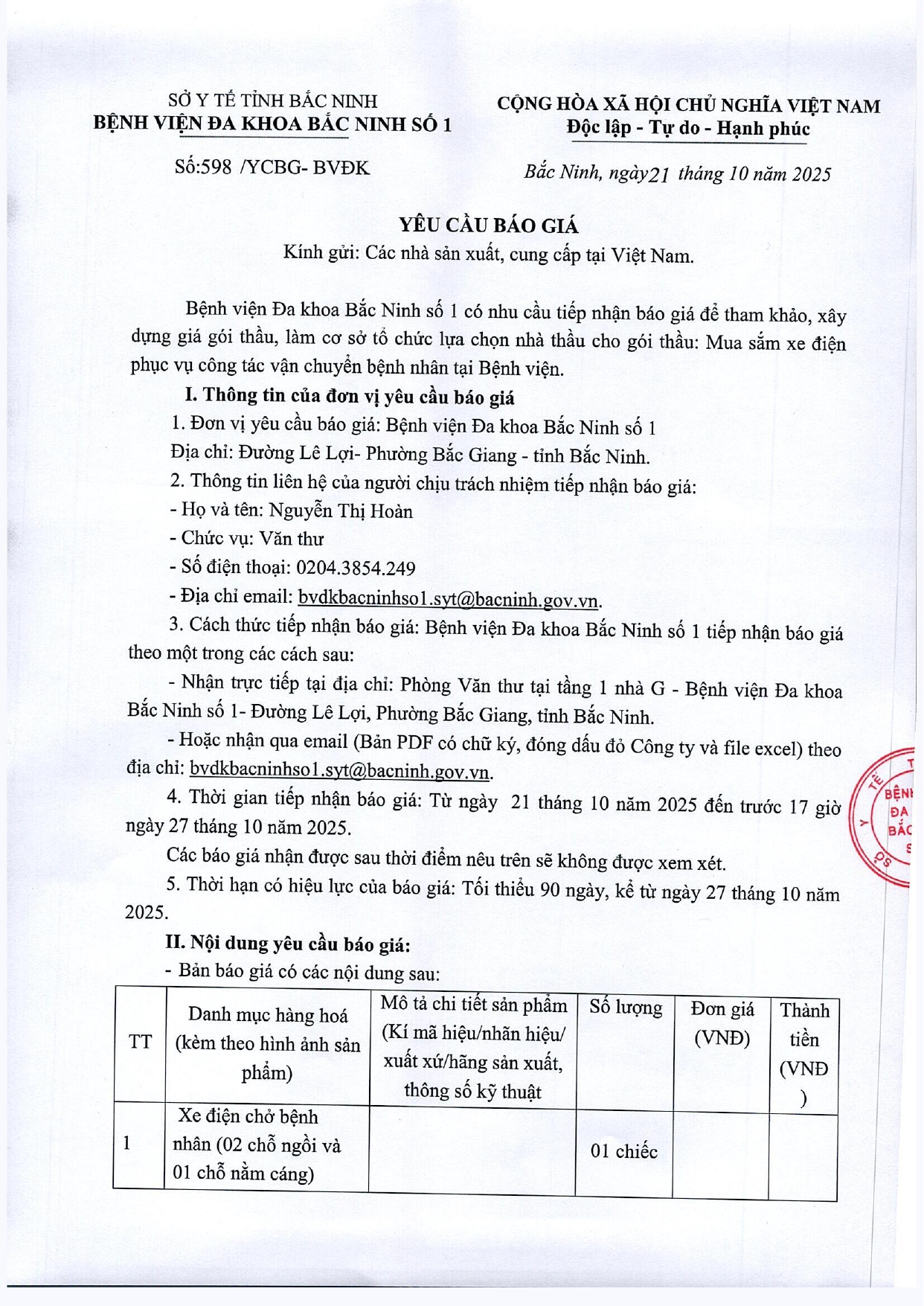 Thứ 3, 21/10/2025 | 08:56 A- A A+ | Yêu cầu báo giá để tham khảo xây dựng giá gói thầu: Mua sắm xe điện phục vụ công tác vận chuyển bệnh nhân tại Bệnh viện Đọc bài Lưu Link Yêu cầu báo giá: 598 YCBG_0001.pdf Tổng số điểm của bài viết là: 0 trong 0 đánh giá Click để đánh giá bài viết