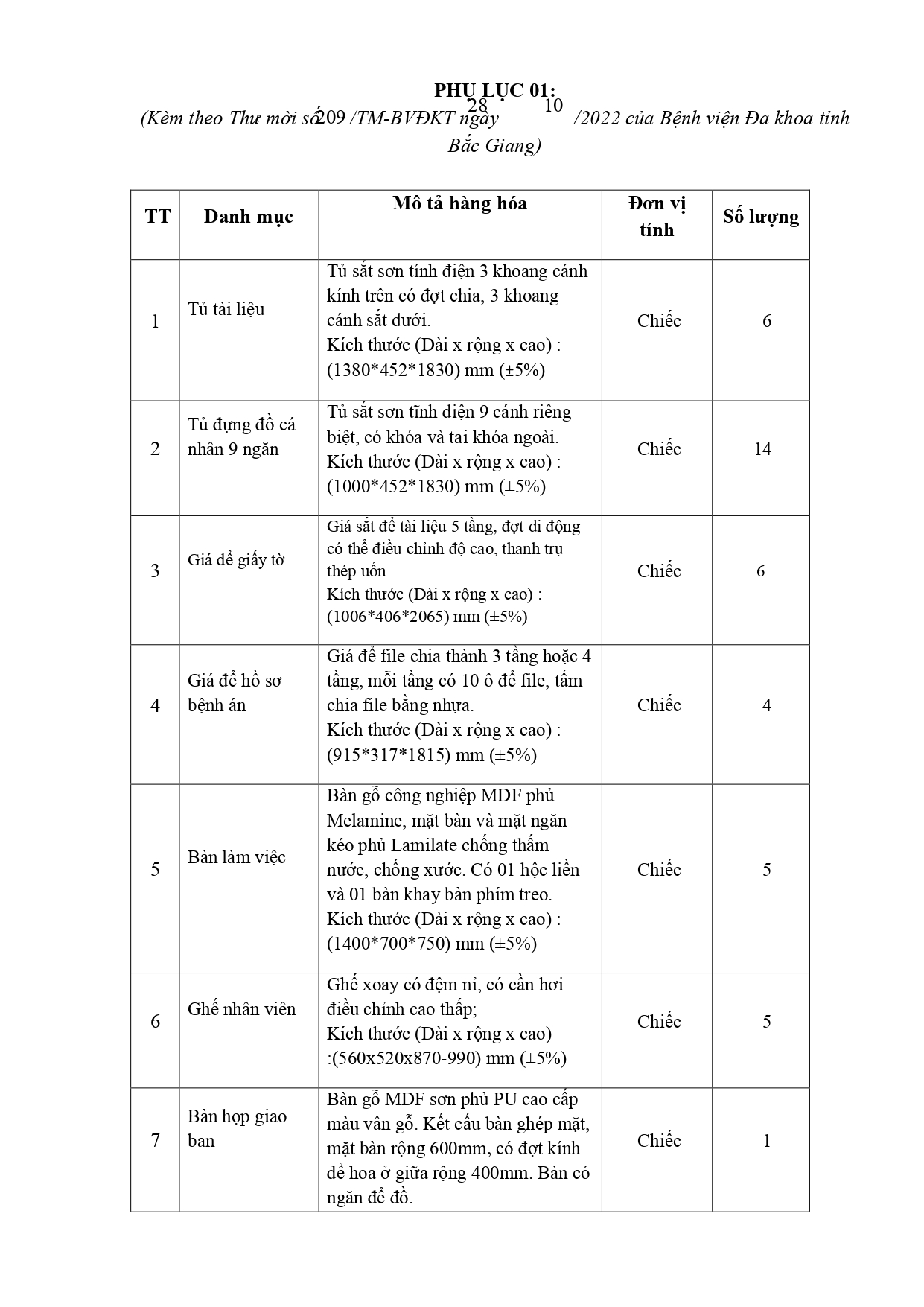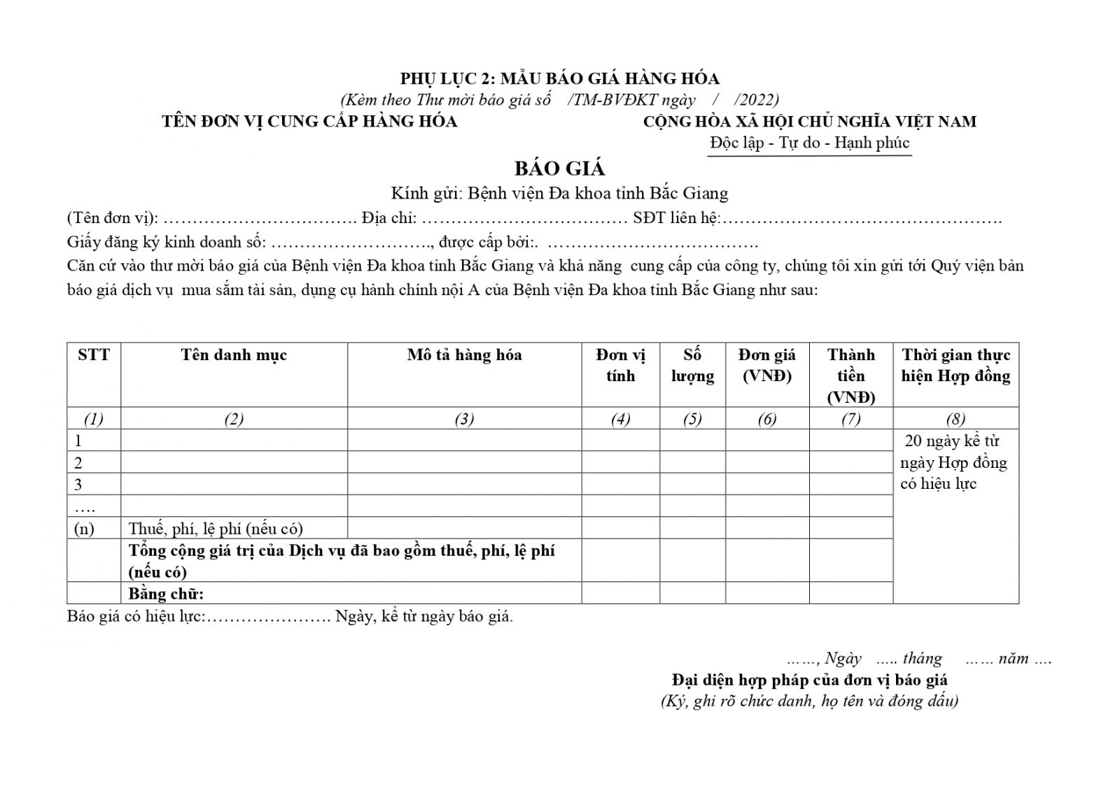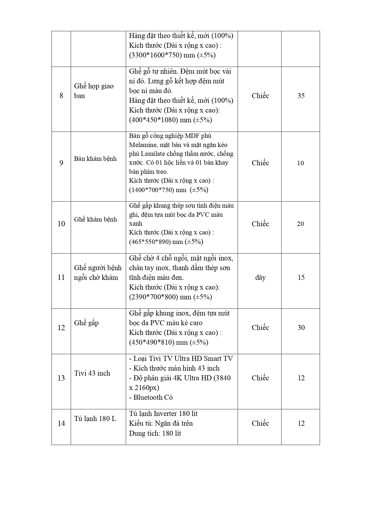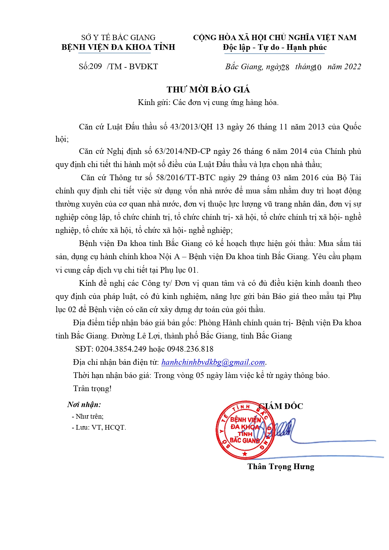 Thư mời báo giá gói thầu: Mua sắm tài sản, dụng cụ hành chính khoa Nội A
