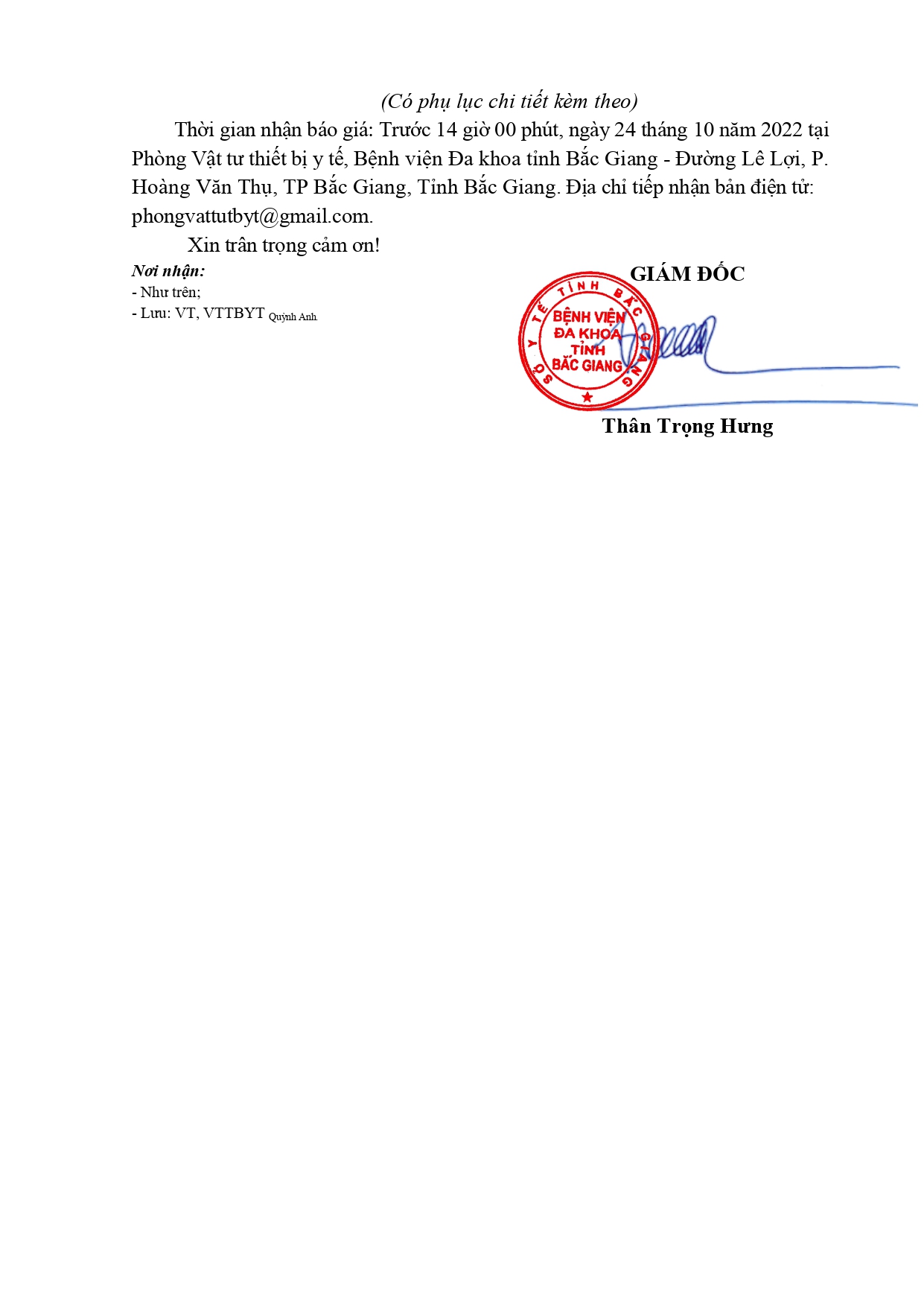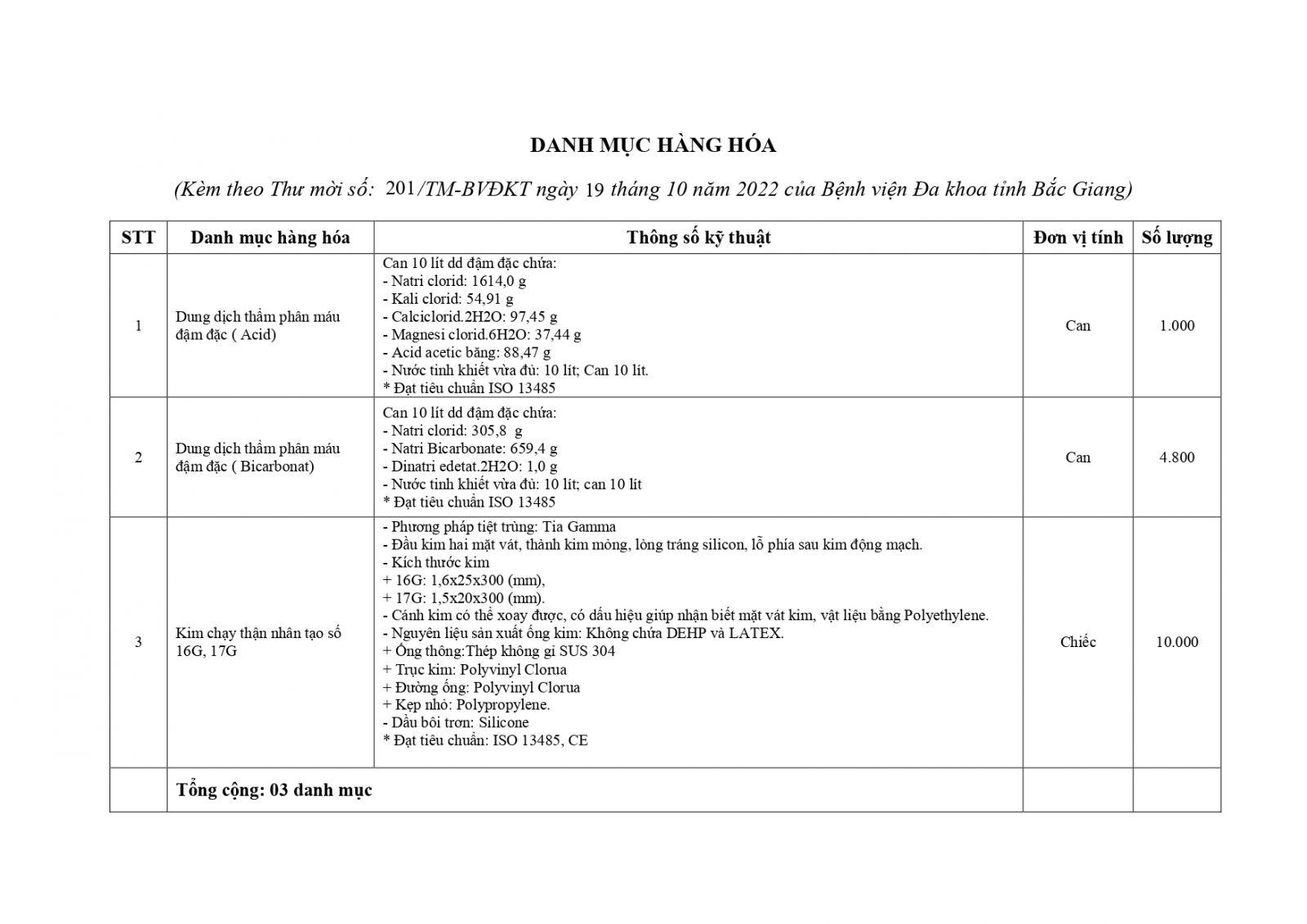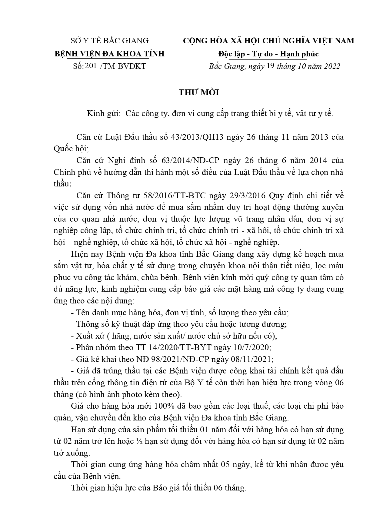 Thứ 4, 19/10/2022 | 15:52 A- A A+ | Thư mời báo giá: mua sắm vật tư, hóa chất y tế sử dụng trong chuyên khoa nội thận tiết niệu, lọc máu phục vụ công tác khám, chữa bệnh Đọc bài Lưu \Download file dưới đây: thư mời báo giá (VT thận)_signed_signed_signed_signed_signed_signed.pdf Tổng số điểm của bài viết là: 0 trong 0 đánh giá Click để đánh giá bài viết