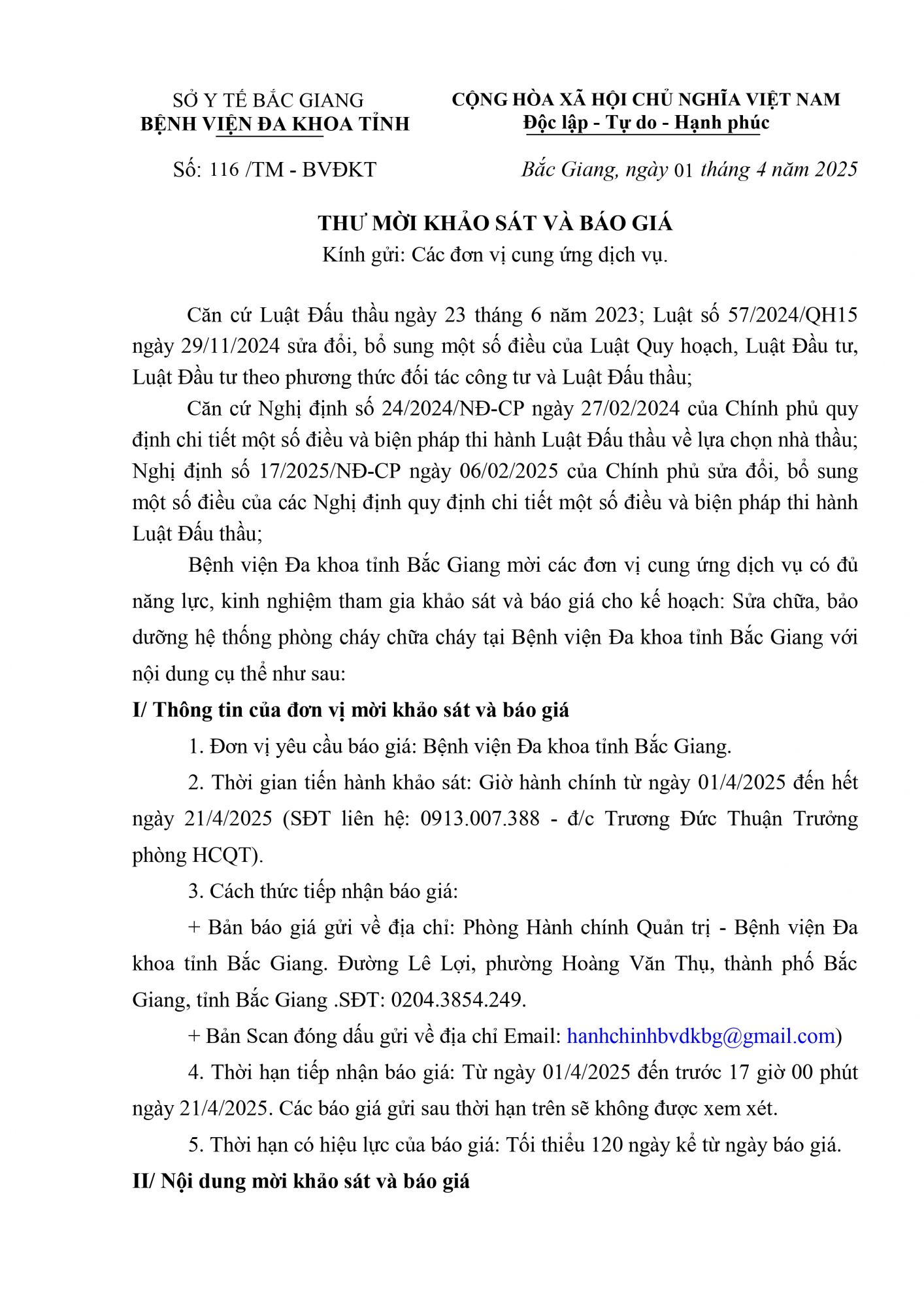 Thứ 3, 01/04/2025 | 11:08 A- A A+ | Thư mời báo giá số 116 ngày 01/4/2025 Đọc bài Lưu Link thư mời : Thu-moi-khao-sat-va-BG-PCCC_signed_signed_signed_signed.pdf Tổng số điểm của bài viết là: 0 trong 0 đánh giá Click để đánh giá bài viết