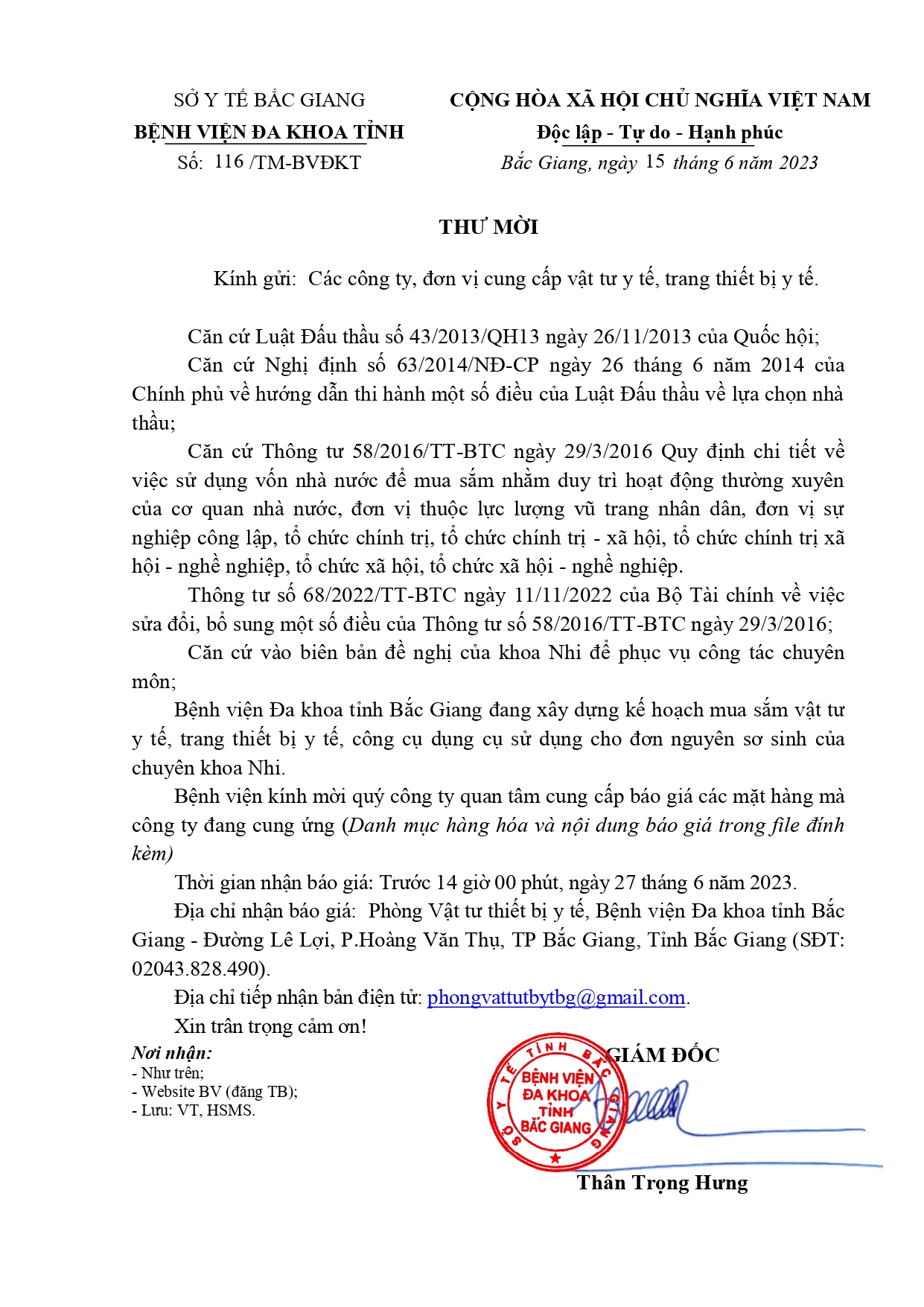 Thứ 5, 15/06/2023 | 13:49 A- A A+ | Thư mời báo giá số 116 ngày 15/6/2023 Đọc bài Lưu File thư mời: thư mời báo giá (TTB)_signed_signed_signed_signed_signed_signed.pdf Tổng số điểm của bài viết là: 0 trong 0 đánh giá Click để đánh giá bài viết