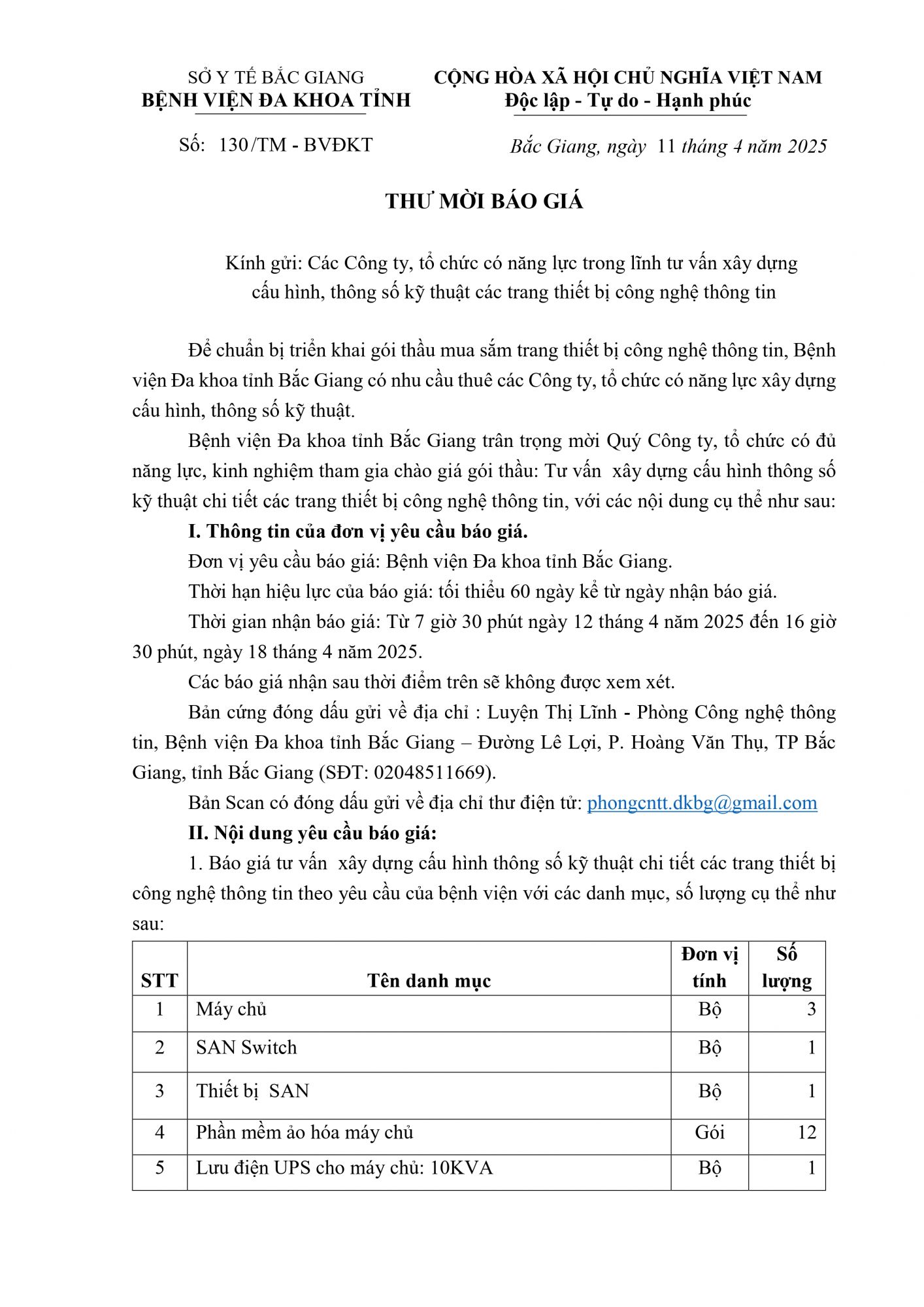 Thứ 6, 11/04/2025 | 16:40 A- A A+ | Thư mời báo giá số 130 Đọc bài Lưu File thư mời: Thu-moi-Goi-tu-van-lap-cau-hinh-thong-so-k-thuat_signed_signed_signed_signed.pdf Tổng số điểm của bài viết là: 0 trong 0 đánh giá Click để đánh giá bài viết