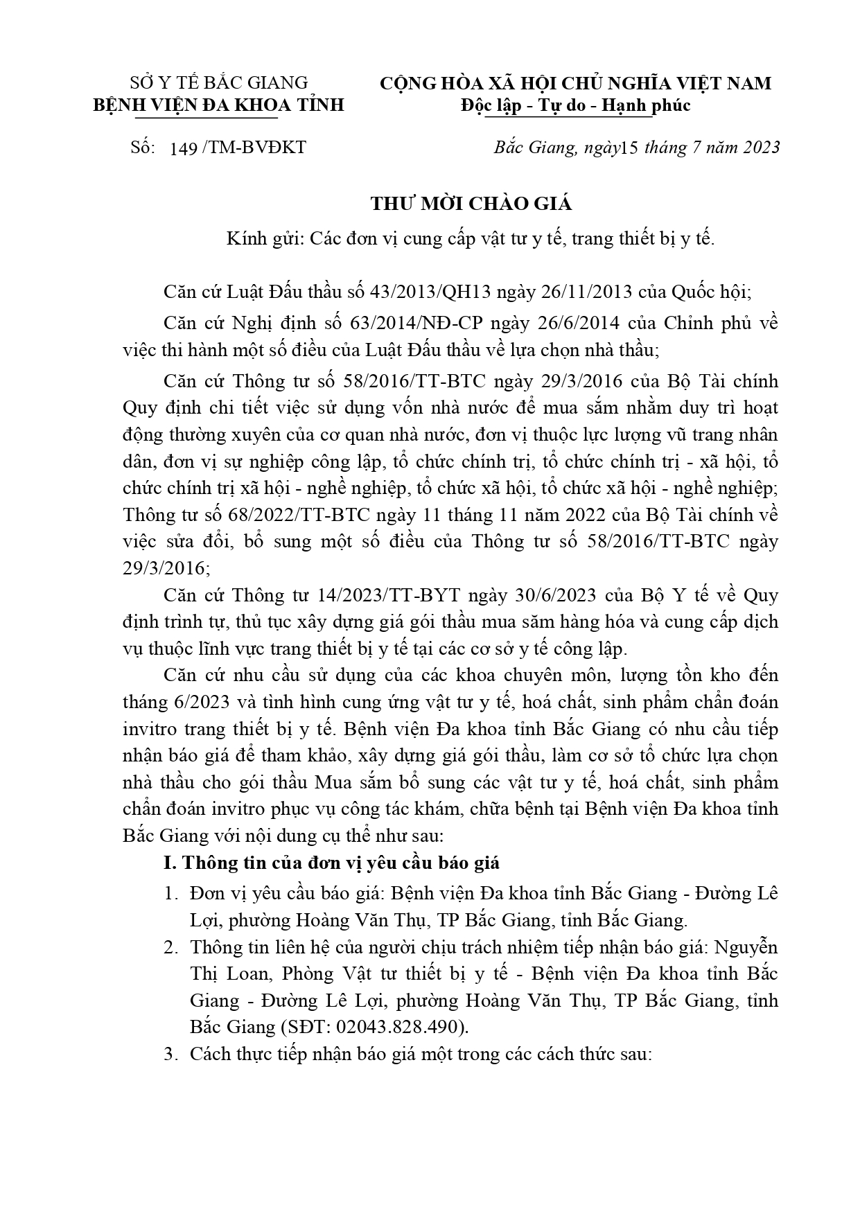 Thứ 2, 17/07/2023 | 15:34 A- A A+ | Thư mời báo giá số 149 ngày 15/7/2023 Đọc bài Lưu File đính kèm: 1. PL báo giá tháng 7.2023 (Họp HĐ)_signed_signed.pdf2. M___u_b__o_gi___TT14_70dd0.docx Tổng số điểm của bài viết là: 0 trong 0 đánh giá Click để đánh giá bài viết