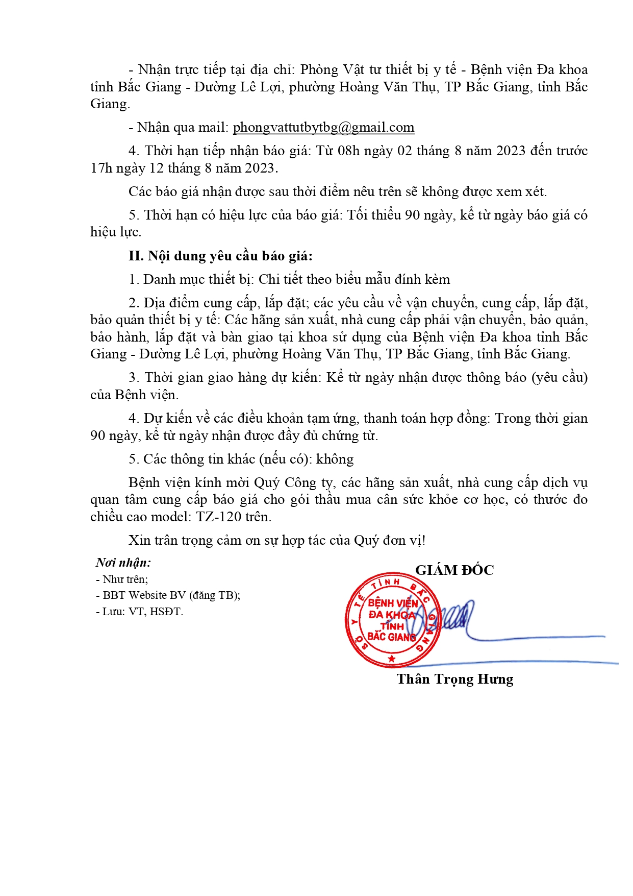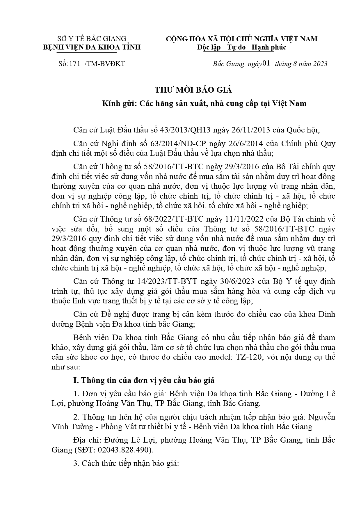 Thứ 4, 02/08/2023 | 10:52 A- A A+ | Thư mời báo giá số 171 ngày 01/08/2023 Đọc bài Lưu File thư mời: Thư mời BG cân đo y tế_signed_signed_signed_signed.pdf Tổng số điểm của bài viết là: 0 trong 0 đánh giá Click để đánh giá bài viết