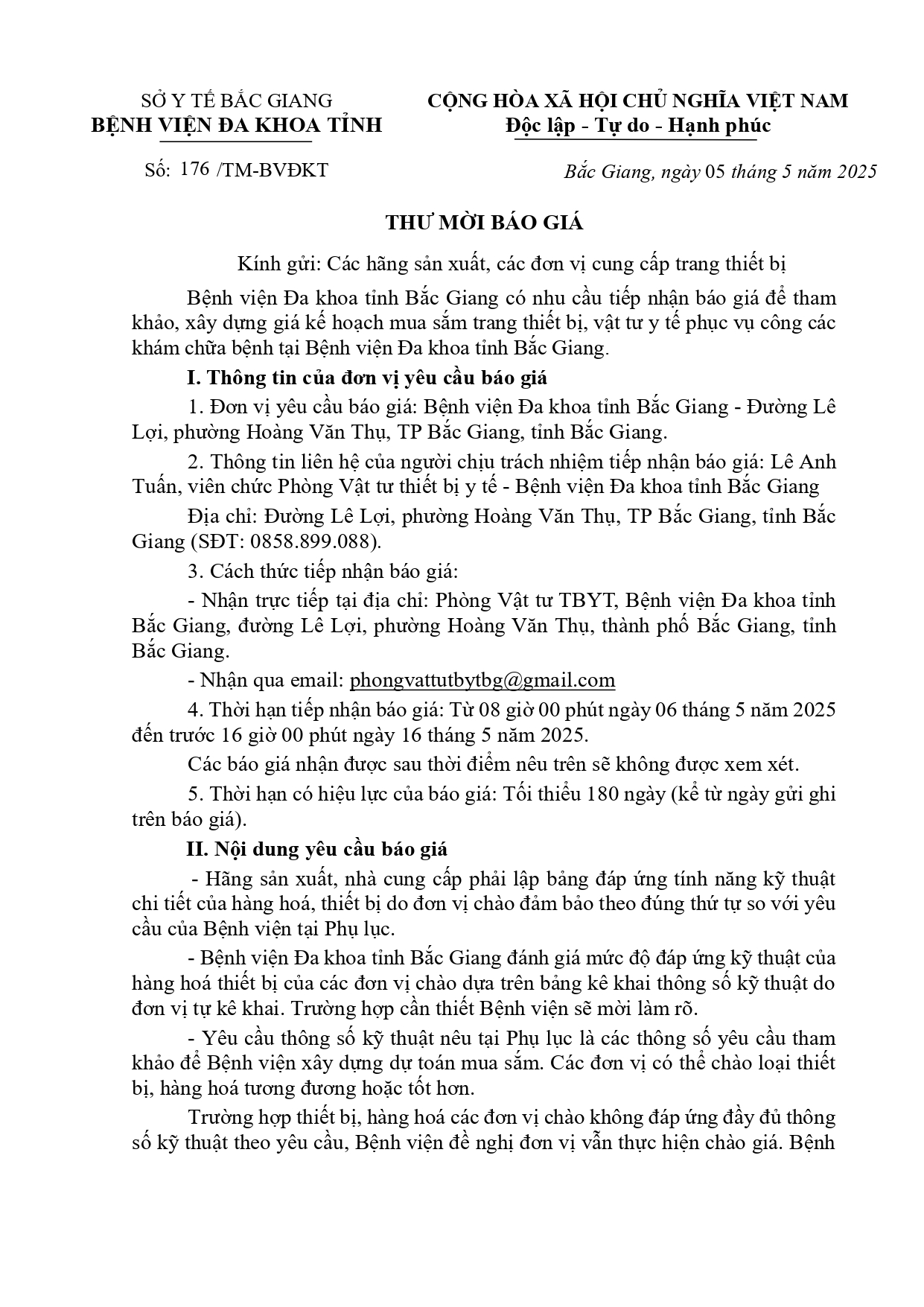 Thứ 3, 06/05/2025 | 10:10 A- A A+ | Thư mời báo giá số 176 Thư mời 176 Đọc bài Lưu Thư mời báo giá + phụ lục: Thư mời 176.rar--------------------- Tổng số điểm của bài viết là: 0 trong 0 đánh giá Click để đánh giá bài viết
