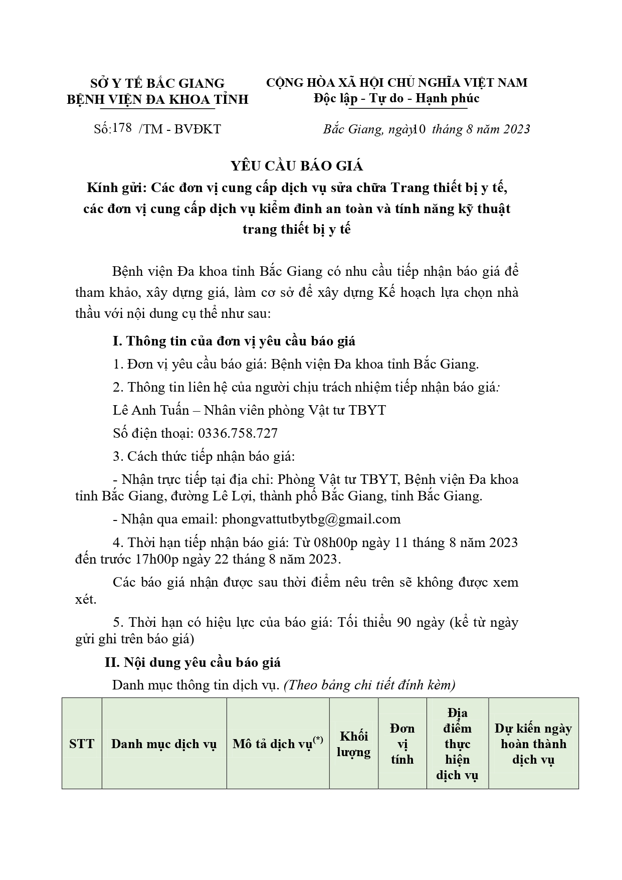 Thứ 6, 11/08/2023 | 06:53 A- A A+ | Thư mời báo giá số 178 ngày 11/08/2023 Đọc bài Lưu File thư mời:Thư mời báo giá (Xquang di động, Kiểm định, Xquang fuji)_signed_signed_signed_signed.pdf Tổng số điểm của bài viết là: 0 trong 0 đánh giá Click để đánh giá bài viết