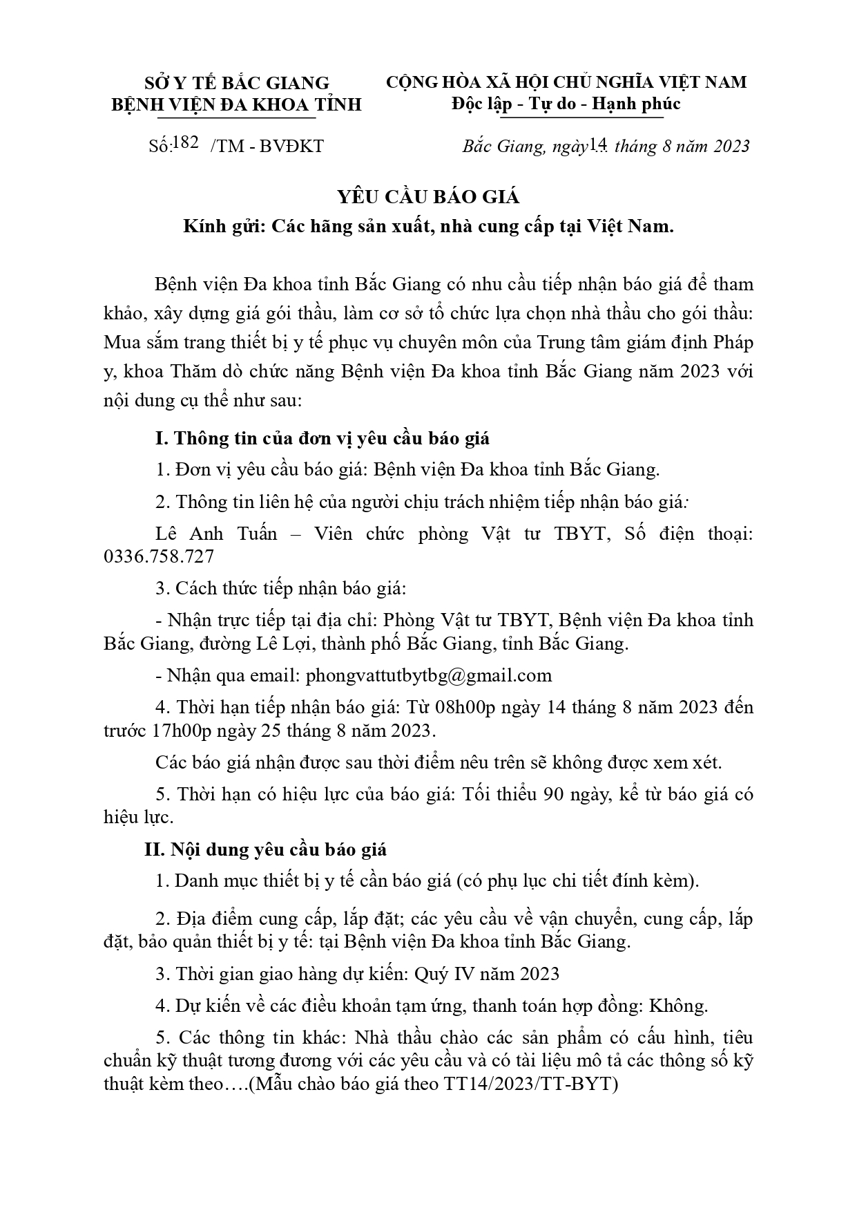 Thứ 2, 14/08/2023 | 08:46 A- A A+ | Thư mời báo giá số 182 ngày 14/08/2023 Đọc bài Lưu File thư mời:Thư mời báo giá hàng hóa (Thiết bị pháp y, siêu âm)_signed_signed_signed_signed.pdf Tổng số điểm của bài viết là: 0 trong 0 đánh giá Click để đánh giá bài viết