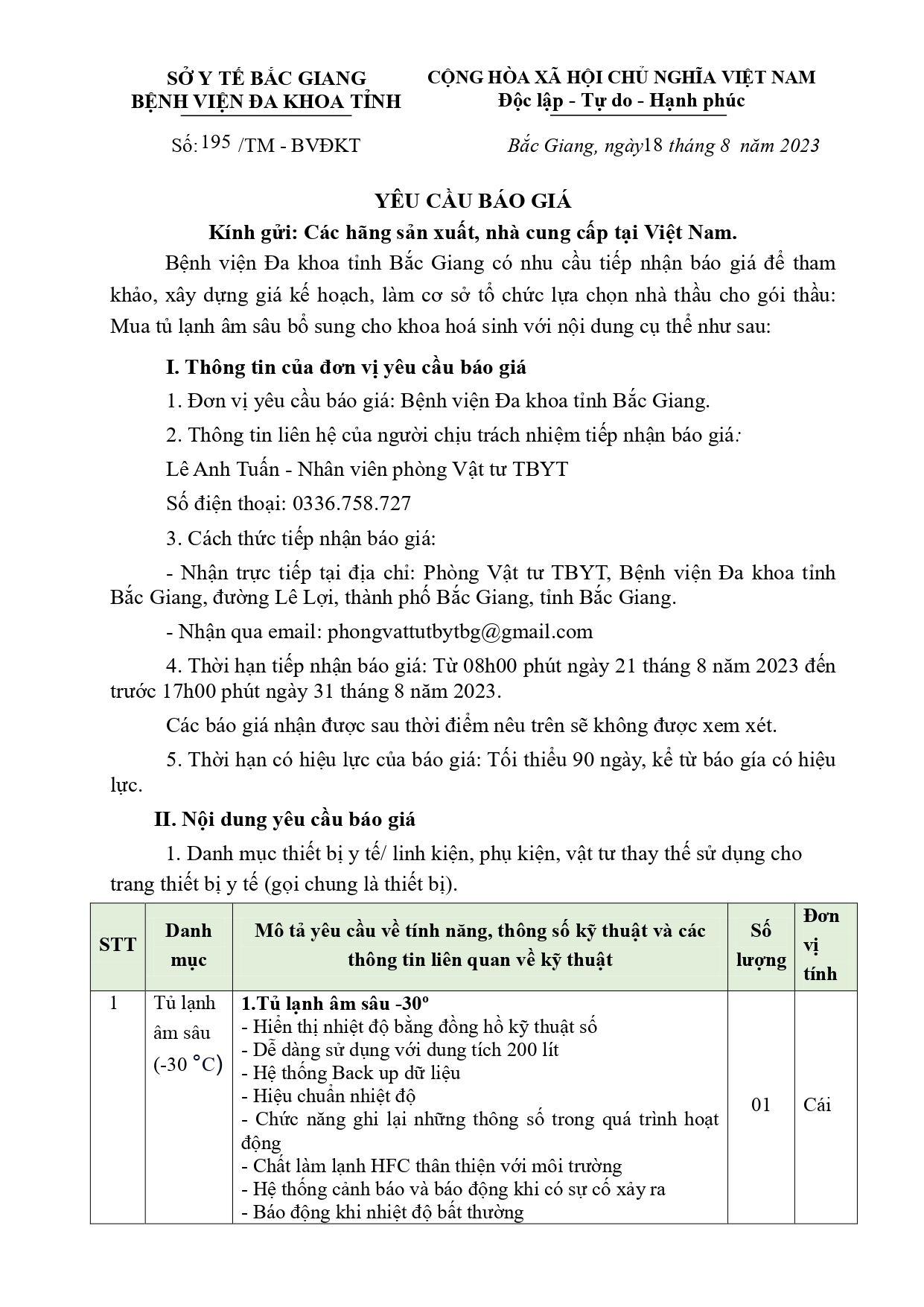 Thứ 2, 21/08/2023 | 09:13 A- A A+ | Thư mời báo giá số 195 ngày 18/08/2023 Đọc bài Lưu File thư mời: Thư mời tủ lạnh_signed_signed_signed_signed.pdf Tổng số điểm của bài viết là: 0 trong 0 đánh giá Click để đánh giá bài viết