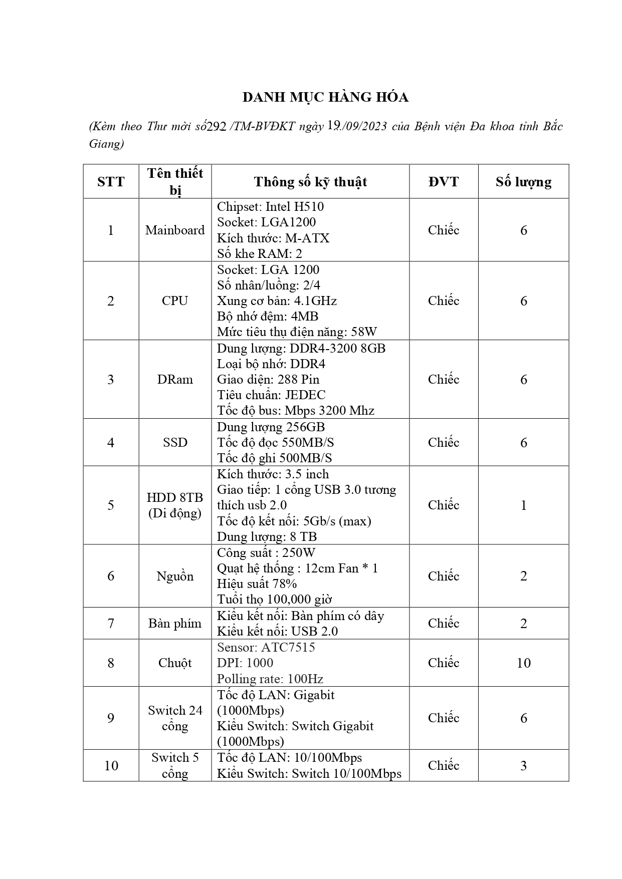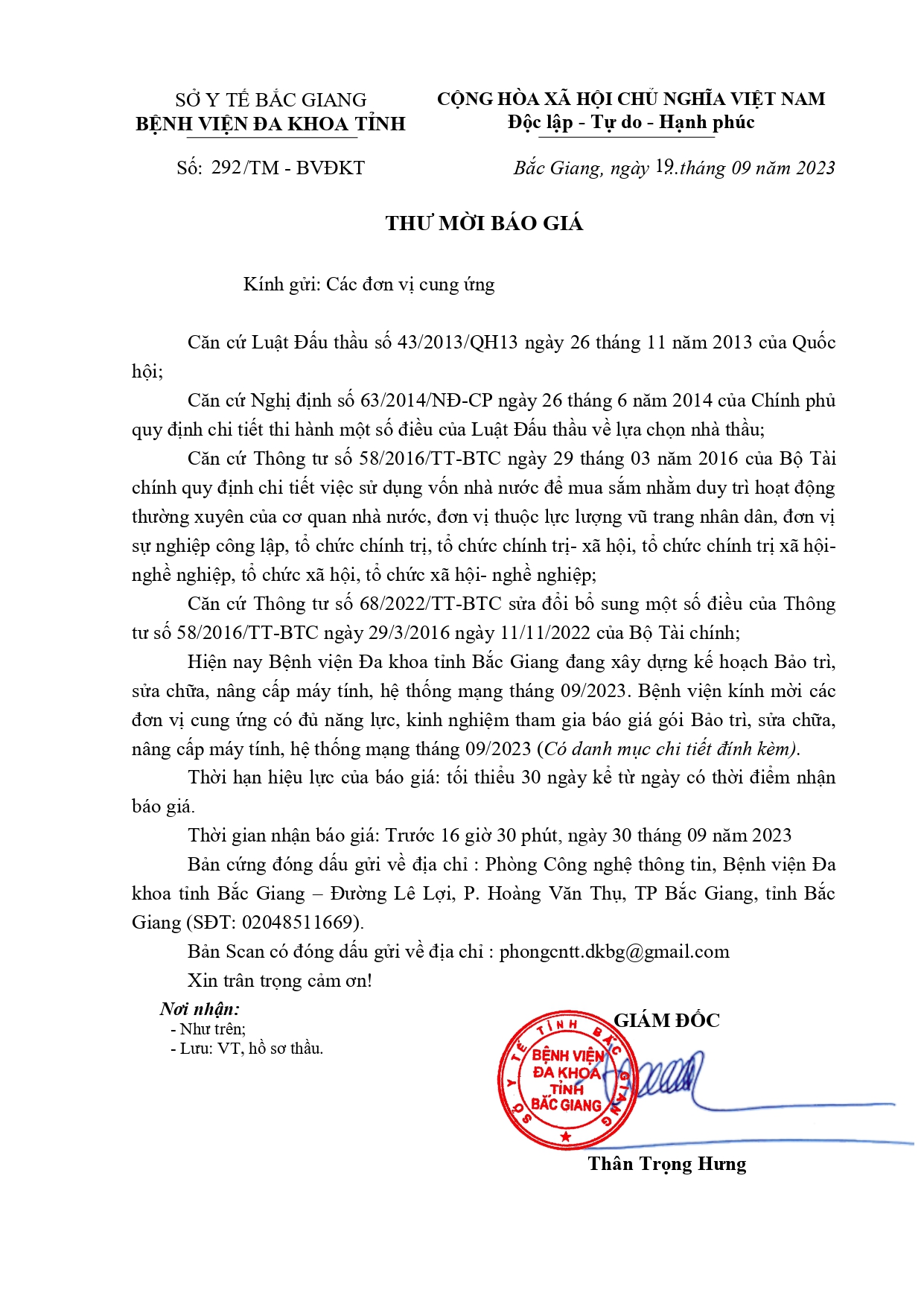 Thứ 4, 20/09/2023 | 15:48 A- A A+ | Thư mời báo giá số 292 ngày 19/09/2023 Đọc bài Lưu File thư mời: Thư mời - Gói Linh Kiện tháng 9-2023_signed_signed_signed_signed_signed_signed.pdf Tổng số điểm của bài viết là: 0 trong 0 đánh giá Click để đánh giá bài viết