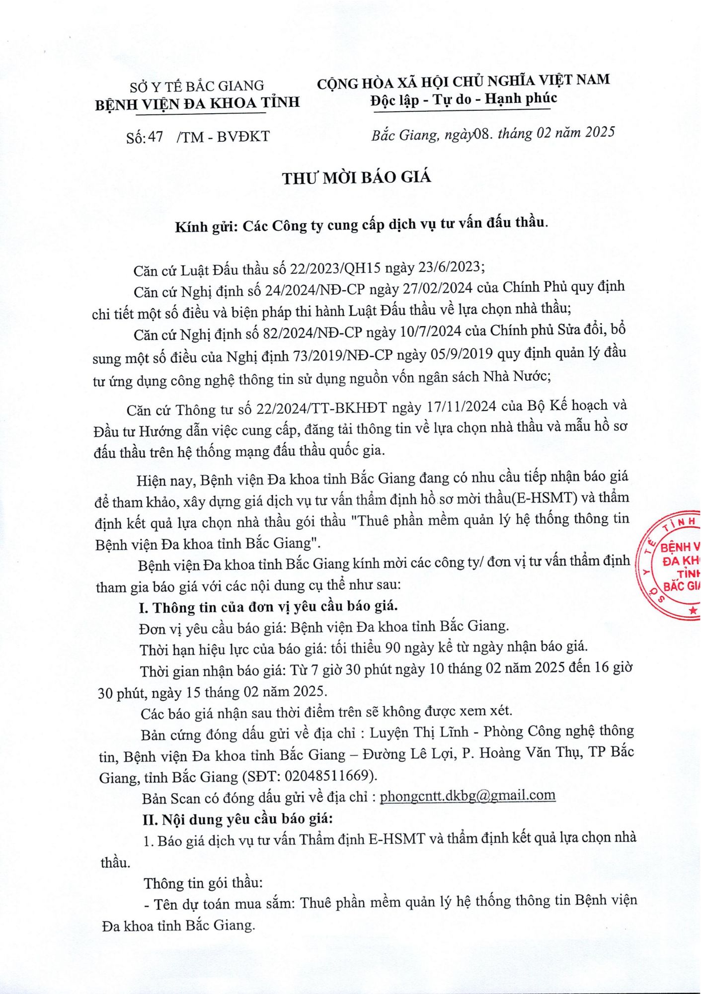 Thứ 7, 08/02/2025 | 10:58 A- A A+ | Thư mời báo giá số 47 ngày 08/2/2025 Đọc bài Lưu Link File thư mời: thư mời báo giá_0001.pdf Tổng số điểm của bài viết là: 0 trong 0 đánh giá Click để đánh giá bài viết