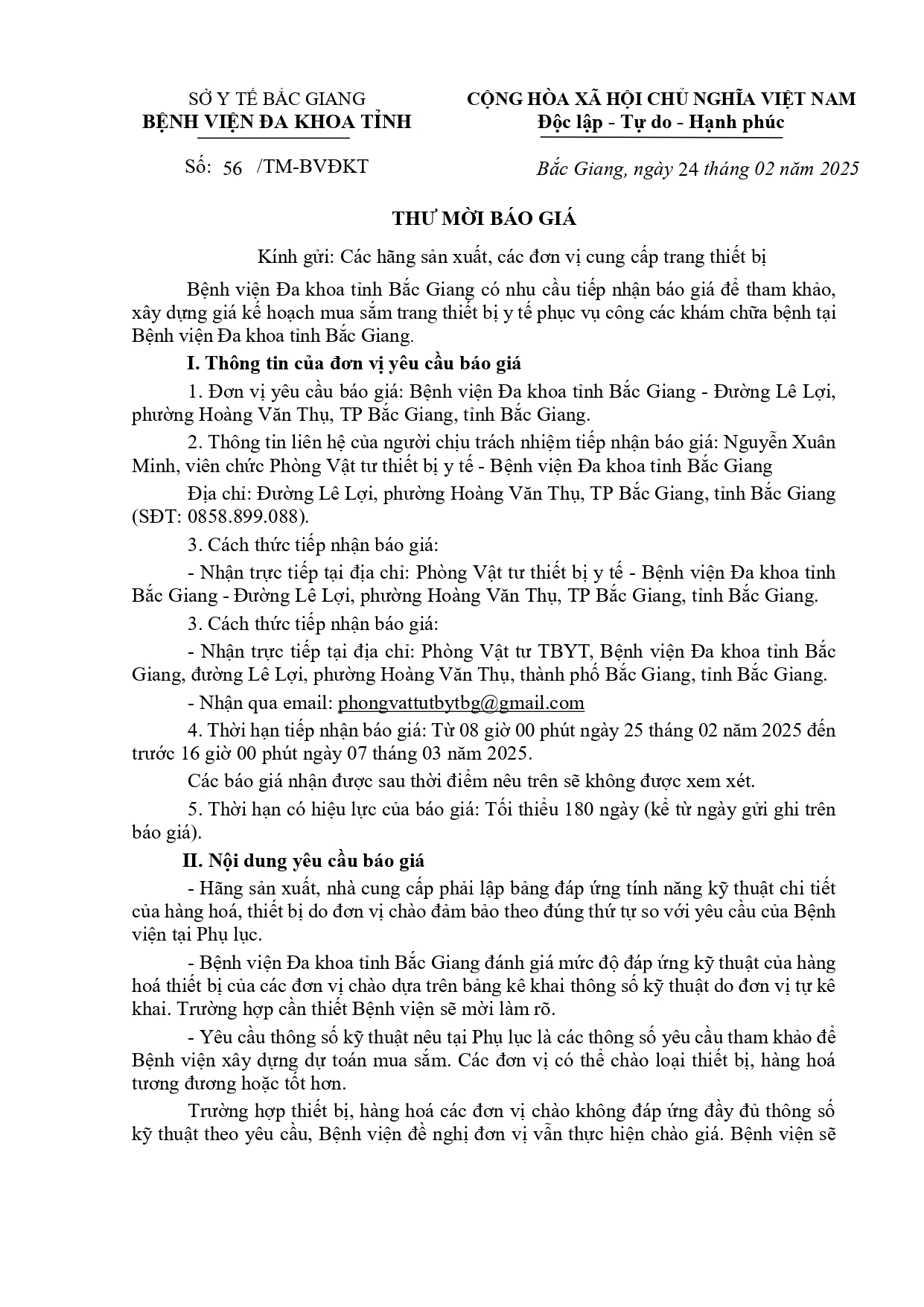 Thứ 6, 28/02/2025 | 10:35 A- A A+ | Thư mời báo giá số 56 Đọc bài Lưu File thư mời kèm phụ lục: Thư mời báo giá số 56.rar---------------------------------------------- Tổng số điểm của bài viết là: 0 trong 0 đánh giá Click để đánh giá bài viết