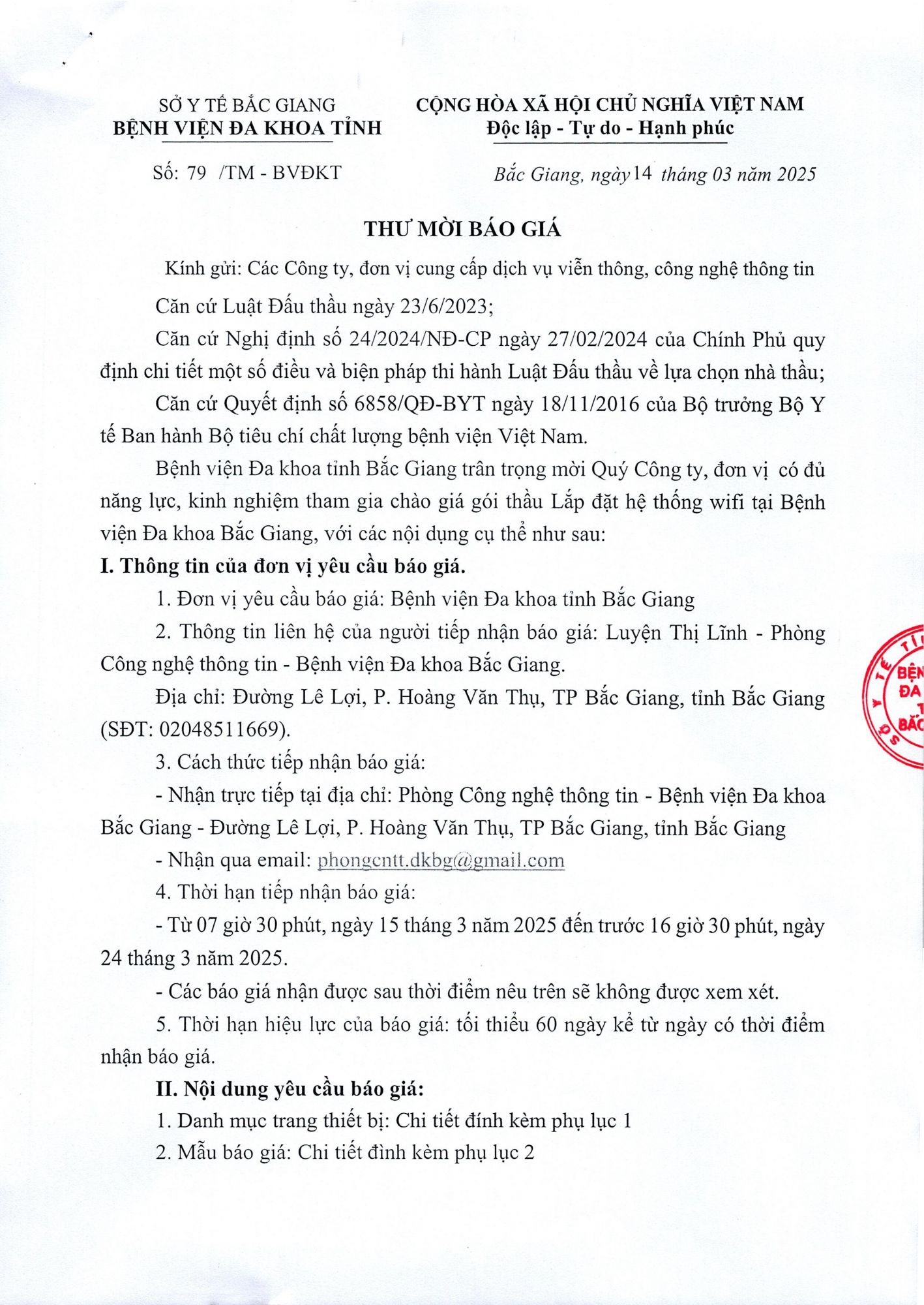 Thứ 6, 14/03/2025 | 17:24 A- A A+ | Thư mời báo giá số 79 ngày 14/3/2025 Đọc bài Lưu File thư mời: Tổng số điểm của bài viết là: 0 trong 0 đánh giá Click để đánh giá bài viết