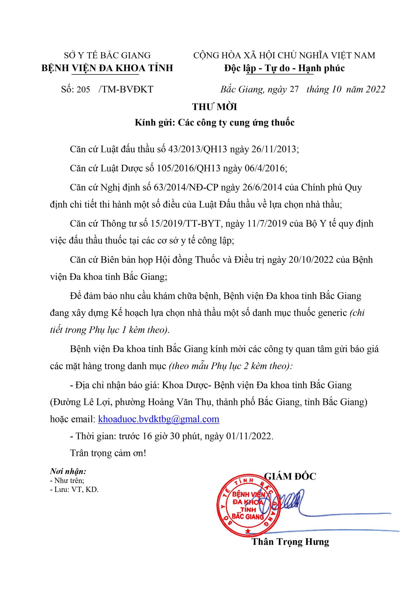 Thứ 6, 28/10/2022 | 09:27 A- A A+ | Thư mời báo giá thuốc Đọc bài Lưu Danh mục thuốc (file đính kèm): Danh mục kèm theo thư mời.docx Tổng số điểm của bài viết là: 0 trong 0 đánh giá Click để đánh giá bài viết