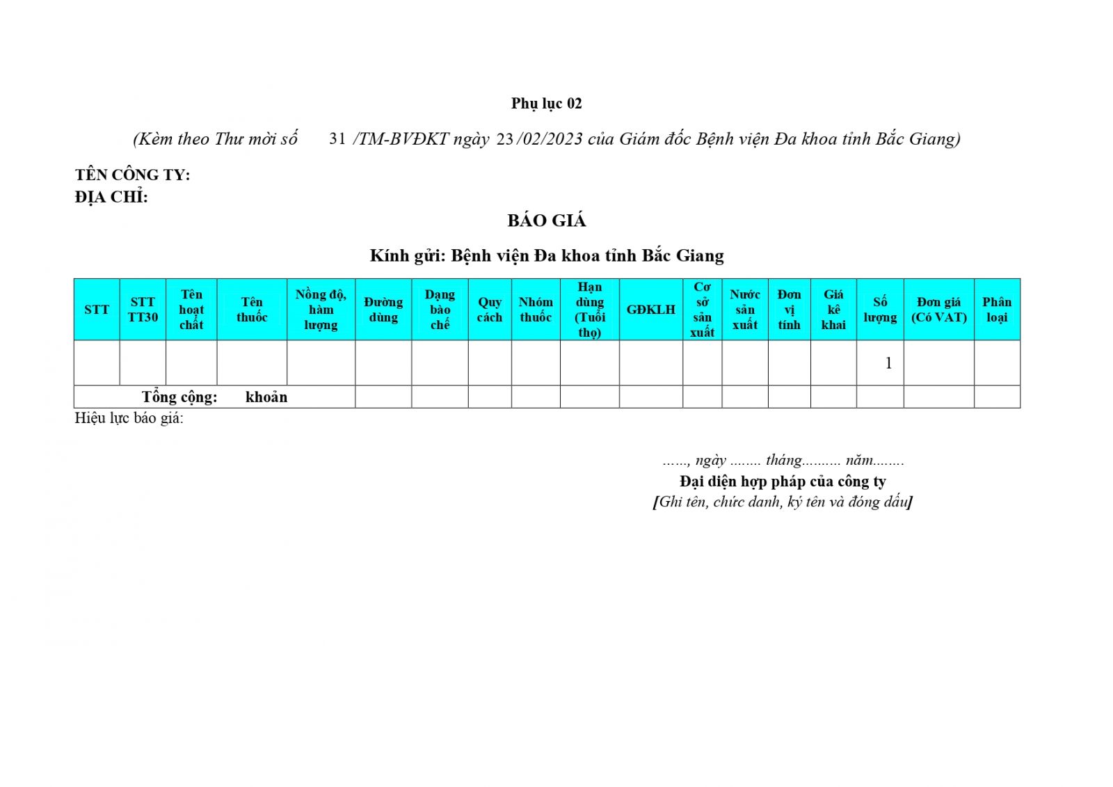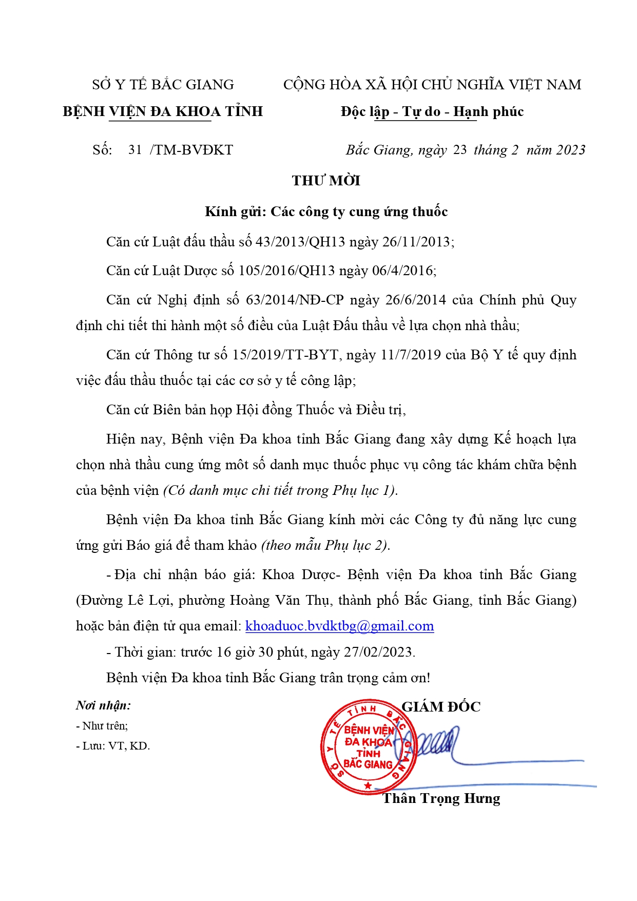 Thư mời của gói thầu: Cung cấp dịch vụ vệ sinh công nghiệp thời gian 24 tháng cho Bệnh viện Đa khoa tỉnh Bắc Giang