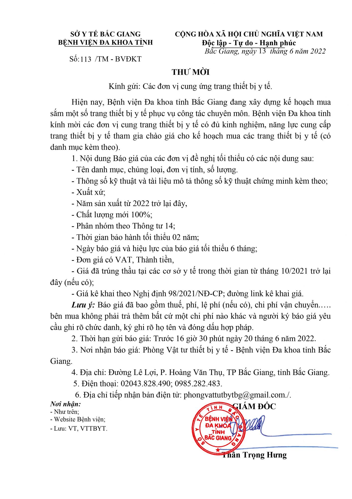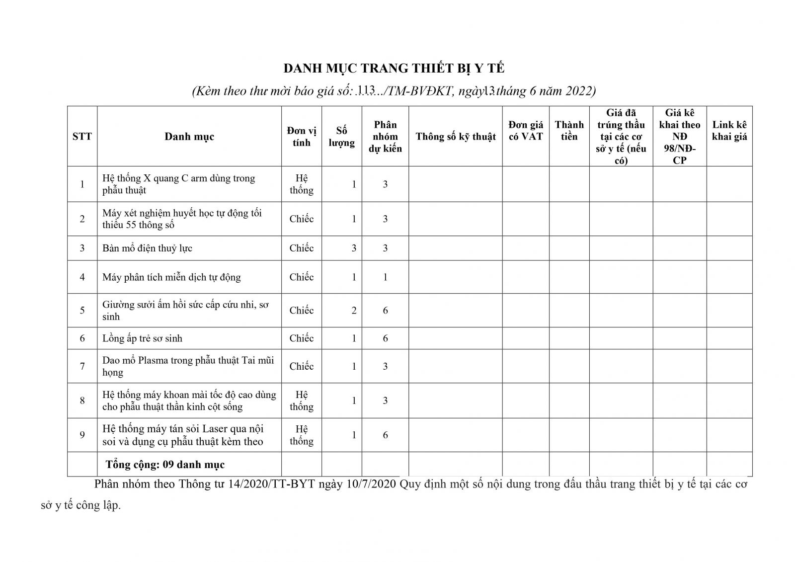 Thư mời báo giá trang thiết bị y tế phục vụ công tác chuyên môn