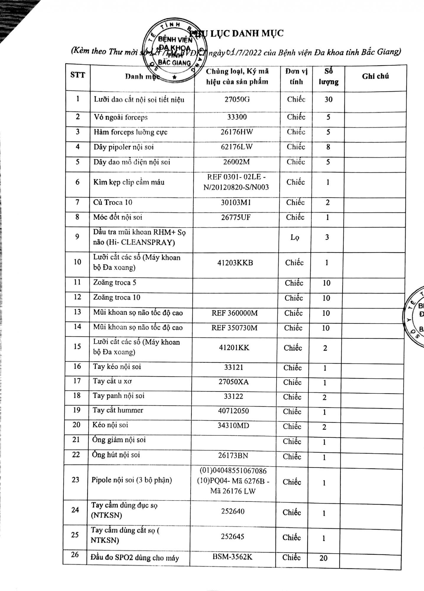 Hiện nay Bệnh viện Đa khoa tỉnh Bắc giang đang xây dựng kế hoạch mua vật tư, trang thiết bị y tế để phục vụ công tác chuyên môn tại bệnh viện. Bệnh viện kính mời các đơn vị cung ứng có đủ năng lực, kinh nghiệm tham gia báo giá vật tư, trang thiết bị y tế (Có danh mục chi tiết đính kèm).