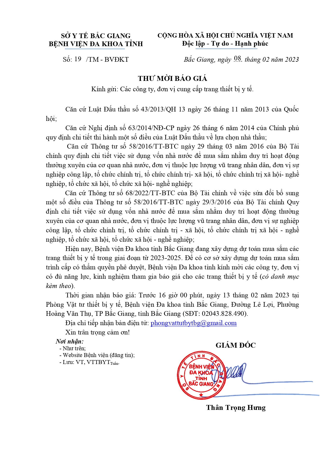 Thư mời báo giá: mua sắm vật tư, hóa chất y tế sử dụng trong chuyên khoa nội thận tiết niệu, lọc máu phục vụ công tác khám, chữa bệnh