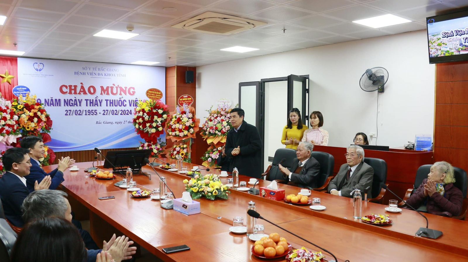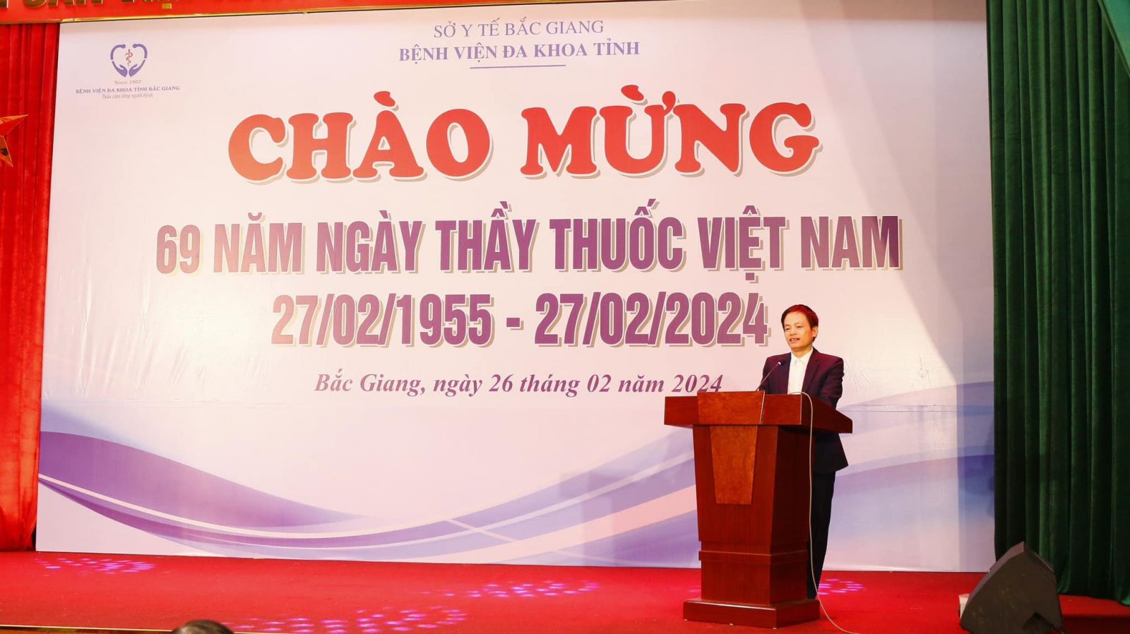 Phát biểu tại đây, BS.CKII Thân Trọng Hưng, Bí thư Đảng uỷ, Giám đốc Bệnh viện đã gửi lời chúc mừng tốt đẹp nhất đến toàn thể cán bộ, viên chức, người lao động Bệnh viện Đa khoa tỉnh Bắc Giang nói riêng và trong ngành Y tế nói chung nhân ngày Thầy thuốc Việt Nam. Đồng chí Giám đốc mong rằng, bằng sự đoàn kết một lòng, sự nỗ lực của toàn thể viên chức và người lao động, phát huy những kết quả đạt được, từng bước khắc phục những hạn chế, tập thể Bệnh viện quyết tâm hoàn thành xuất sắc mọi nhiệm vụ được giao trong năm 2024.