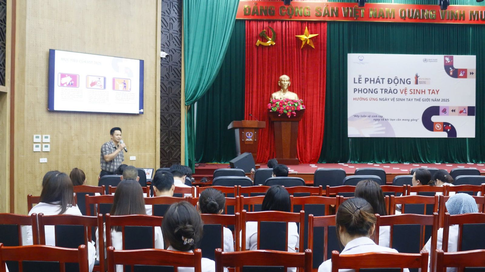 Tại buổi lễ, Trưởng khoa Khoa Kiểm soát nhiễm khuẩn, ThS Vũ Văn Bằng đã giới thiệu chủ đề năm 2025 của WHO; nhấn mạnh 5 thời điểm vệ sinh tay bắt buộc trong chăm sóc y tế; đồng thời phân tích các lỗi thường gặp trong sử dụng găng tay và thực hành vệ sinh tay chưa đúng kỹ thuật. Những nội dung này nhằm nâng cao nhận thức và thay đổi hành vi của nhân viên y tế, hướng tới môi trường chăm sóc an toàn, sạch khuẩn.
