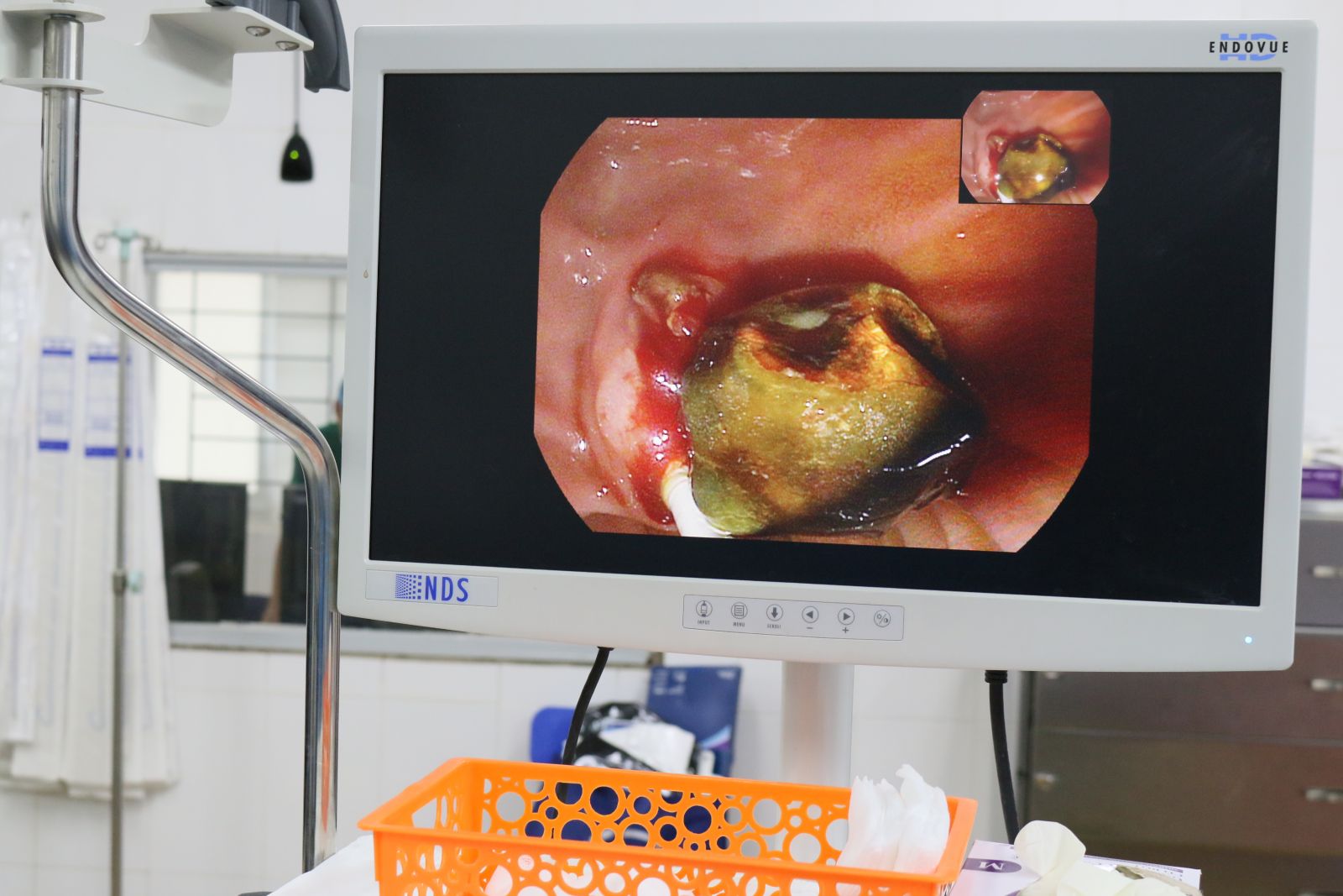 Sau 45 phút đồng hồ, ca can thiệp đã diễn ra thuận lợi và an toàn, sỏi mật có kích thước 9x15mm được lấy hết ra khỏi ống mật chủ của người bệnh. Hiện tại, người bệnh ổn định, giảm đau bụng, tình trạng ứ mật được giải phóng và tiếp tục được theo dõi tại khoa Ngoại tiêu hoá.
