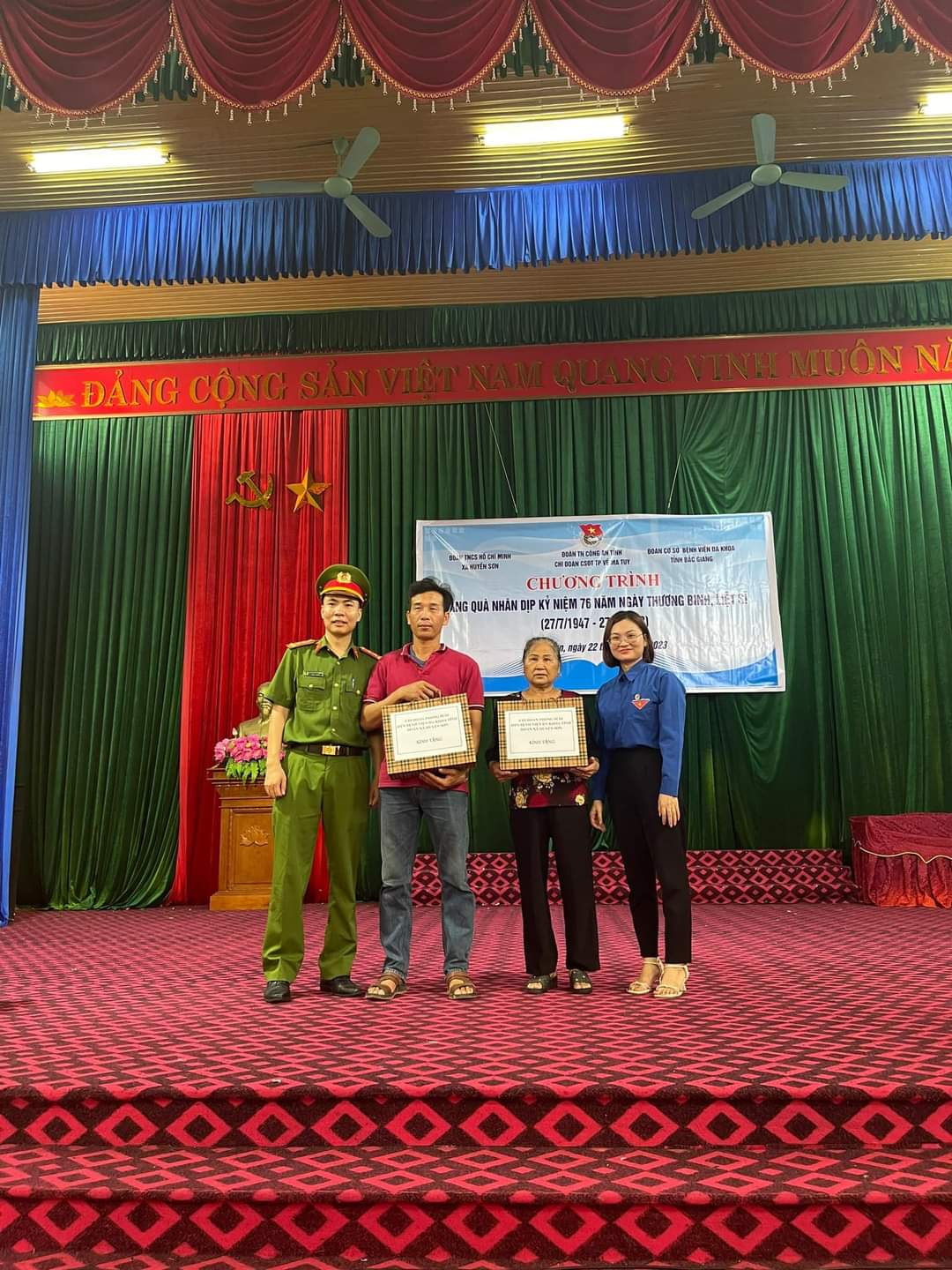 Theo đó, ngày 22/7/2023 Đoàn cơ sở Bệnh viện Đa khoa tỉnh phối hợp với Chi đoàn phòng PC04, Công an tỉnh tổ chức chỉnh trang, dọn vệ sinh và dâng hoa, thắp hương tri ân, tưởng nhớ các Anh hùng Liệt sỹ tại Nghĩa trang Liệt sỹ xã Huyền Sơn, huyện Lục Nam. Cùng ngày, đoàn tiến hành thăm hỏi và tặng 20 phần quà, mỗi suất trị giá 350.000 đồng tới các gia đình thương binh, liệt sĩ, người có công với cách mạng trên địa bàn xã.