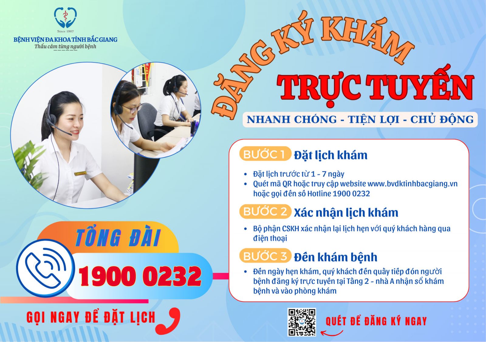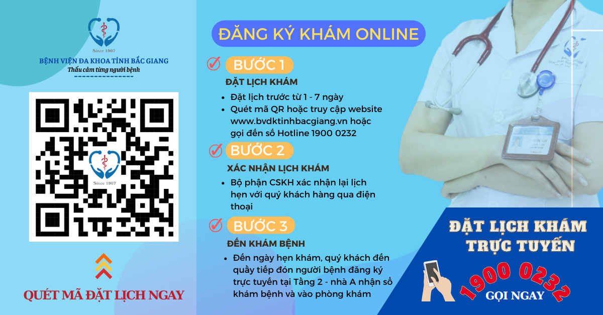 Nhằm nâng cao chất lượng dịch vụ chăm sóc và tư vấn sức khỏe, đảm bảo quyền lợi cho người bệnh. Bệnh viện Đa khoa tỉnh Bắc Giang triển khai dịch vụ đặt lịch khám bệnh trực tuyến để đáp ứng nhu cầu khám, chữa bệnh ngày càng cao của người dân, giúp giảm thiểu tối đa thời gian chờ đợi, người bệnh có thể chủ động sắp xếp quỹ thời gian của mình trong việc đi khám chữa bệnh được thuận lợi nhất.