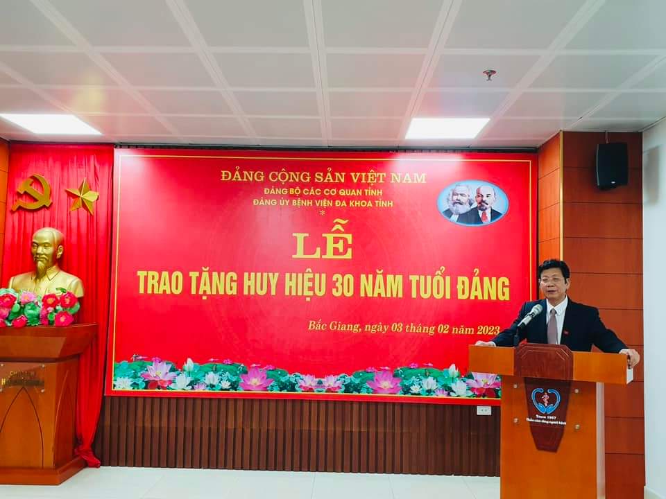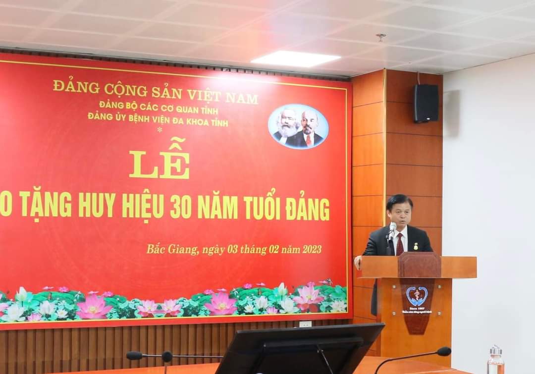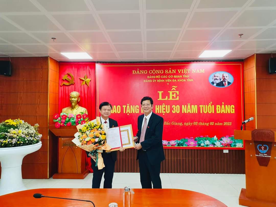Chiều 03/2/2023, Đảng bộ Bệnh viện Đa khoa tỉnh Bắc Giang tổ chức lễ trao tặng Huy hiệu 30 năm tuổi Đảng cho đồng chí Vũ Thanh Giang, Phó Bí thư Đảng uỷ, Phó Giám đốc Bệnh viện.